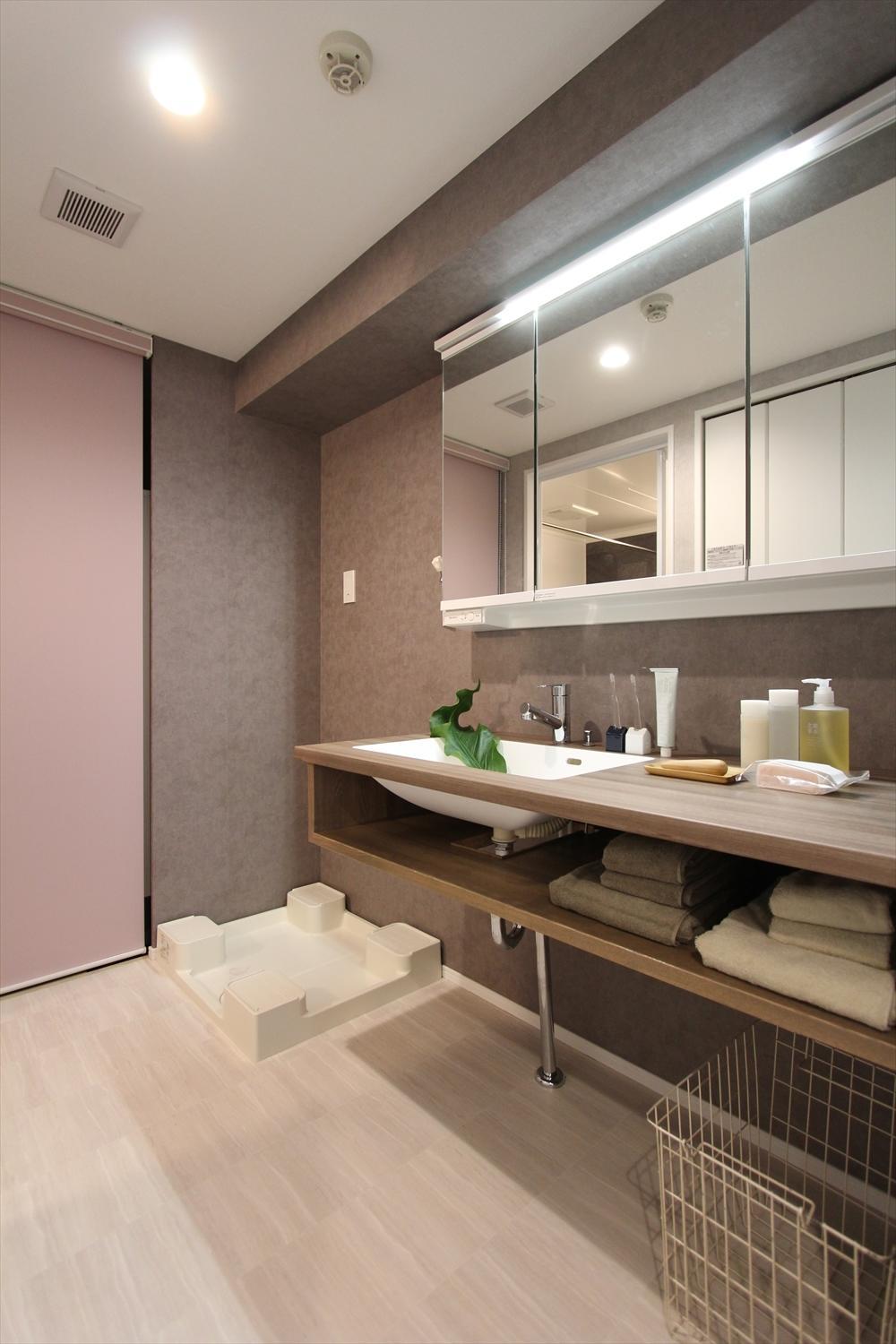 メタリックなラメ感のあるグレーの濃淡の壁に、高級感のあるダークな木目のカウンターが映える、ホテルライクな設えの洗面空間。洗面台の背面には、小物やタオル類を収納できるクローゼットを備えました。パイプスペースを隠すロールスクリーンは、2019年のミラノサローネでも人気のグレージュにピンクをアクセントに加えるカラーリングを意識した奥様セレクトです。造作の洗面台は、木目のシートがオシャレなだけでなく、継ぎ目のないボウルをセレクトすることで、お手入れしやすく機能的なデザインが◎。