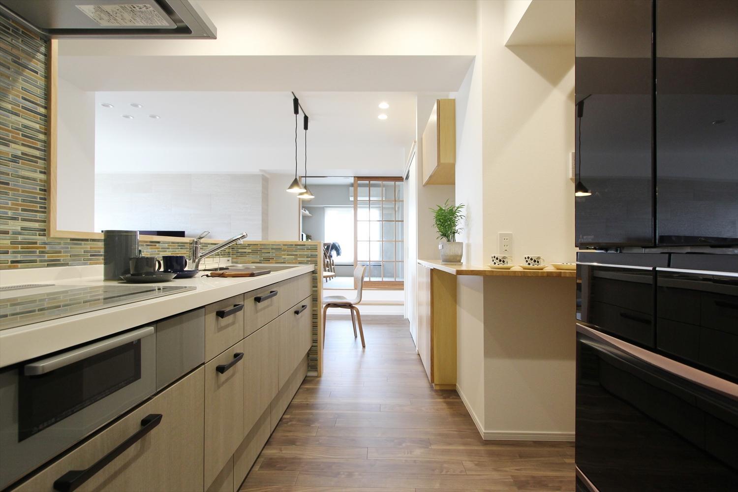 キッチンはグレージュな床とも相性バッチリの、同じトーンの木目タイプをセレクト。I型のキッチンカウンター後ろには、家事動線にこだわったカップボードや大容量の収納棚を配置。アクセントにグレー、ブルーに加えてグリーンカラーもミックスされたモザイクタイルを貼ることで、室内のグリーンとの調和も図ります。