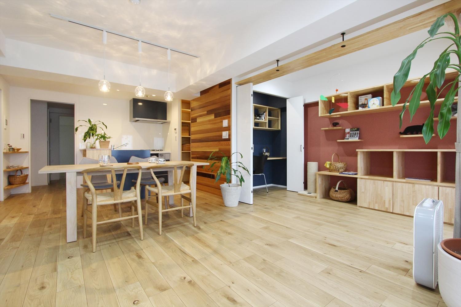 もともとLDKと納戸を仕切っていた壁を取り払うことで、広々としたリビング空間に生まれ変わりました。玄関にも使用したアクセントとなるレッドシダーのパネルを、リビングの随所に採用することで、全体のまとまりを意識した空間に。デザイン性だけでなく快適性にもこだわり、すべての窓に内窓(インプラス)を加え、断熱性能・防音効果が飛躍的に向上しました。これまで3つのエアコンを使用していましたが、リノベーション後は1つに減らしても快適な暮らしを送れるようになりました。猫ちゃんも落ち着いている時間が増えた、とオーナーご夫婦も喜んでいます。また、「青」が好きな奥様と、「赤」が好きなご主人様。それぞれの好きなカラーが喧嘩をしないようにレイアウトし、視覚的にも楽しく過ごせるよう工夫しました。奥様の好きな「青」を面材に採用したLIXILのアレスタ。パントリーの棚は、枠から5cm内側に入れることで、正面から中のモノが見えず、スッキリ見えるよう設計しました。ダイニングテーブルの上のペンダントライトはガラスタイプをチョイス。照明をつけた時の天井へのリフレクションが、光の波紋のように広がり、効果的に演出されています。