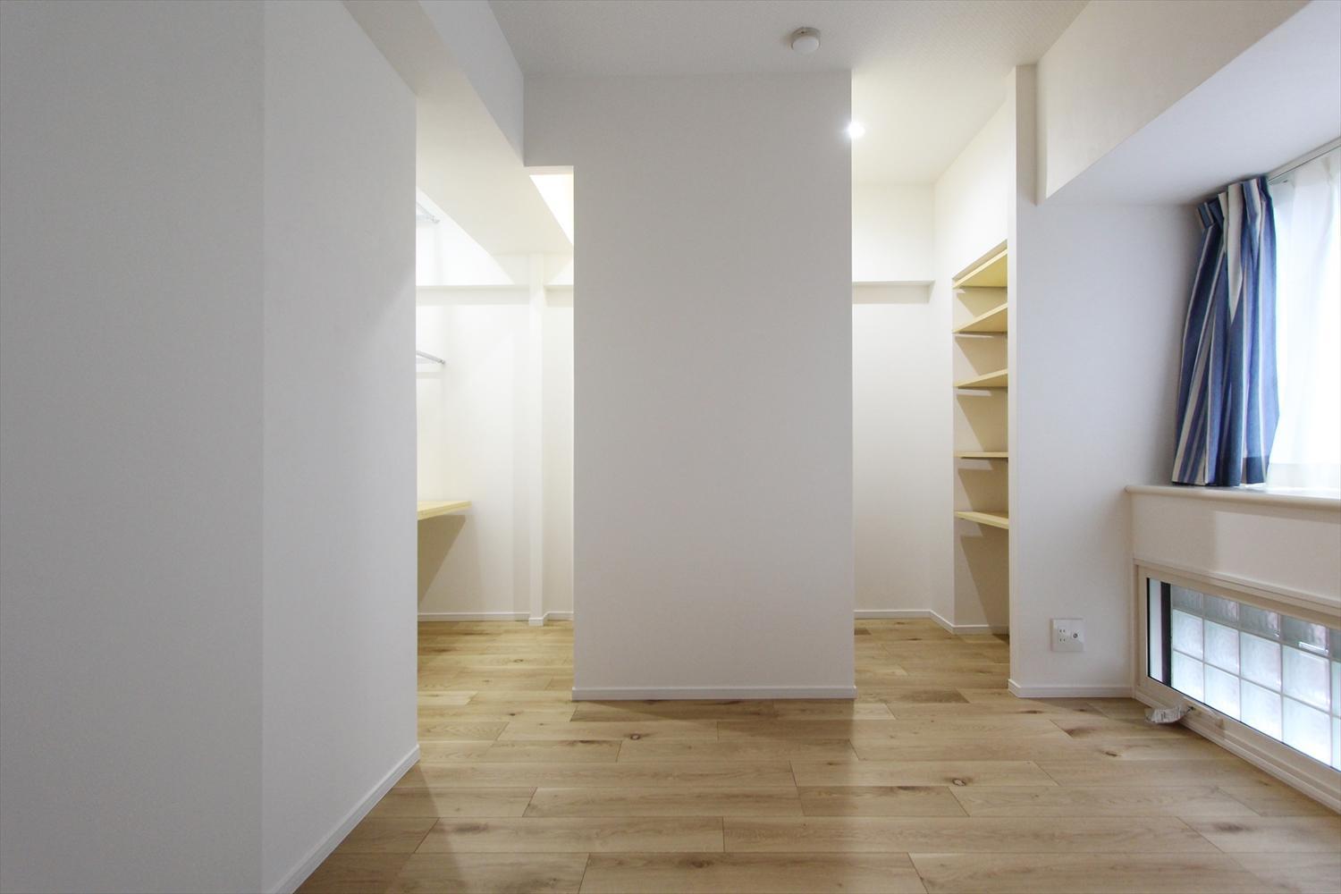 洋服が大好きな奥様のための、大容量ウォークインクローゼット。中央に壁パネルを設けて2通路にすることで、収納量と使い勝手にこだわりました。正面から見た際、棚部分が隠れるように設計し、スッキリと見せる工夫をしています。