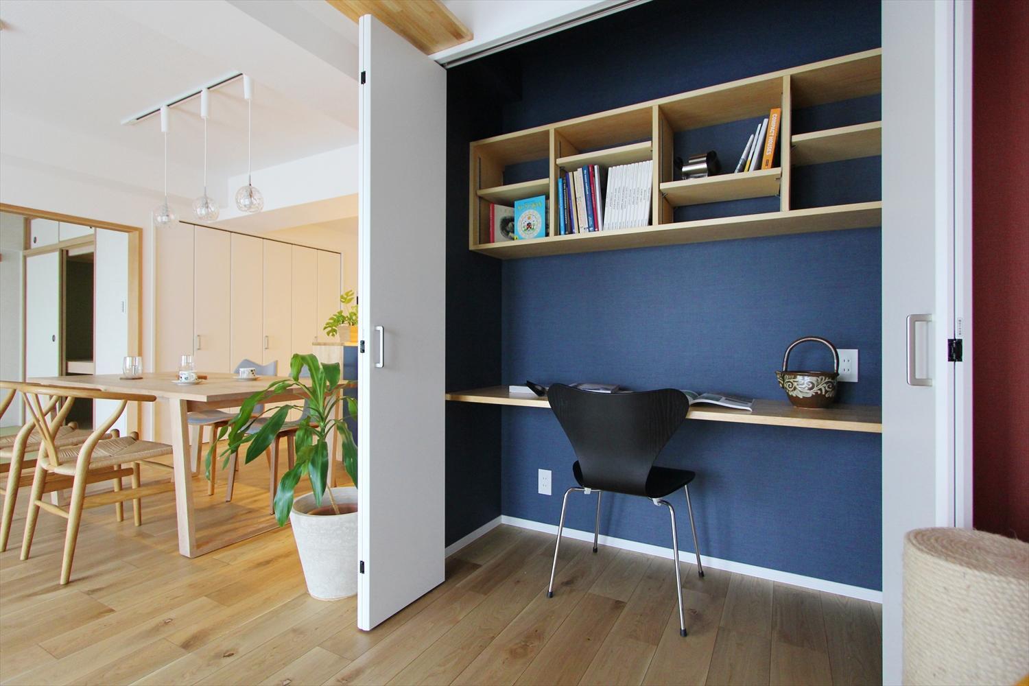 ご主人様のご要望を叶えた書斎スペース。設計時点では「本や作業中の書類などを猫ちゃんにイタズラされては困る」という理由でクローゼットドアを設けましたが、実際に暮らし始めたオーナーご夫婦に話を聞くと「急な来客の際にもドアを閉めるだけで隠せるから使いやすい」という意外な評価も。『猫ファースト=人ファースト』な機能です。イスを置いたままでも、干渉せずにドアを閉められるよう設計されている点がポイントです。