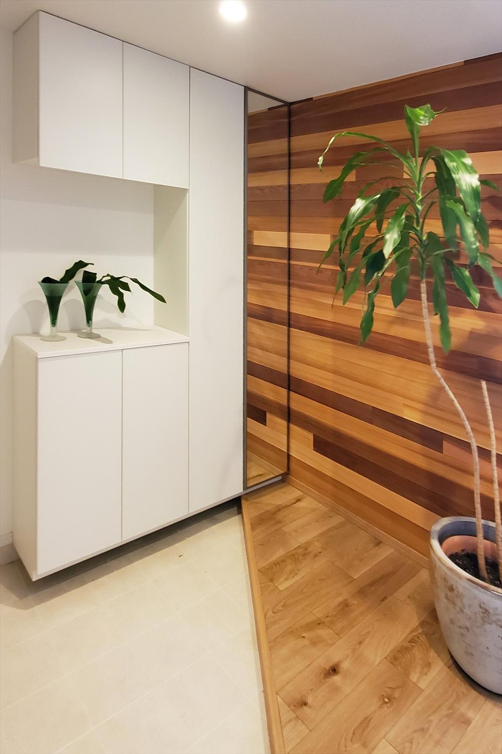 レッドシダーの羽目板パネルに一目惚れしたご主人様のご要望にあわせ、印象的な玄関になるようなご提案をしました。シューズボックス横にミラーを備え、映し出されたレッドシダーによって奥行感が増し、空間に広がりが生まれる視覚効果をプラス。タイル部分と床部分の境を斜めにレイアウトすることで、外履きで使えるスペースを広げている点も特徴です。