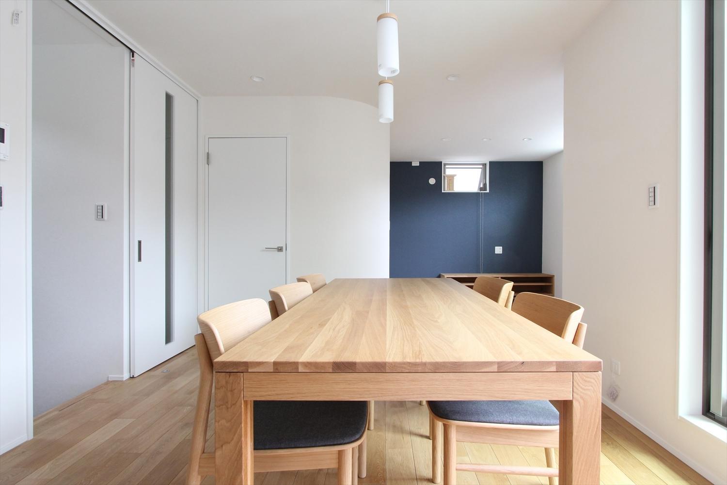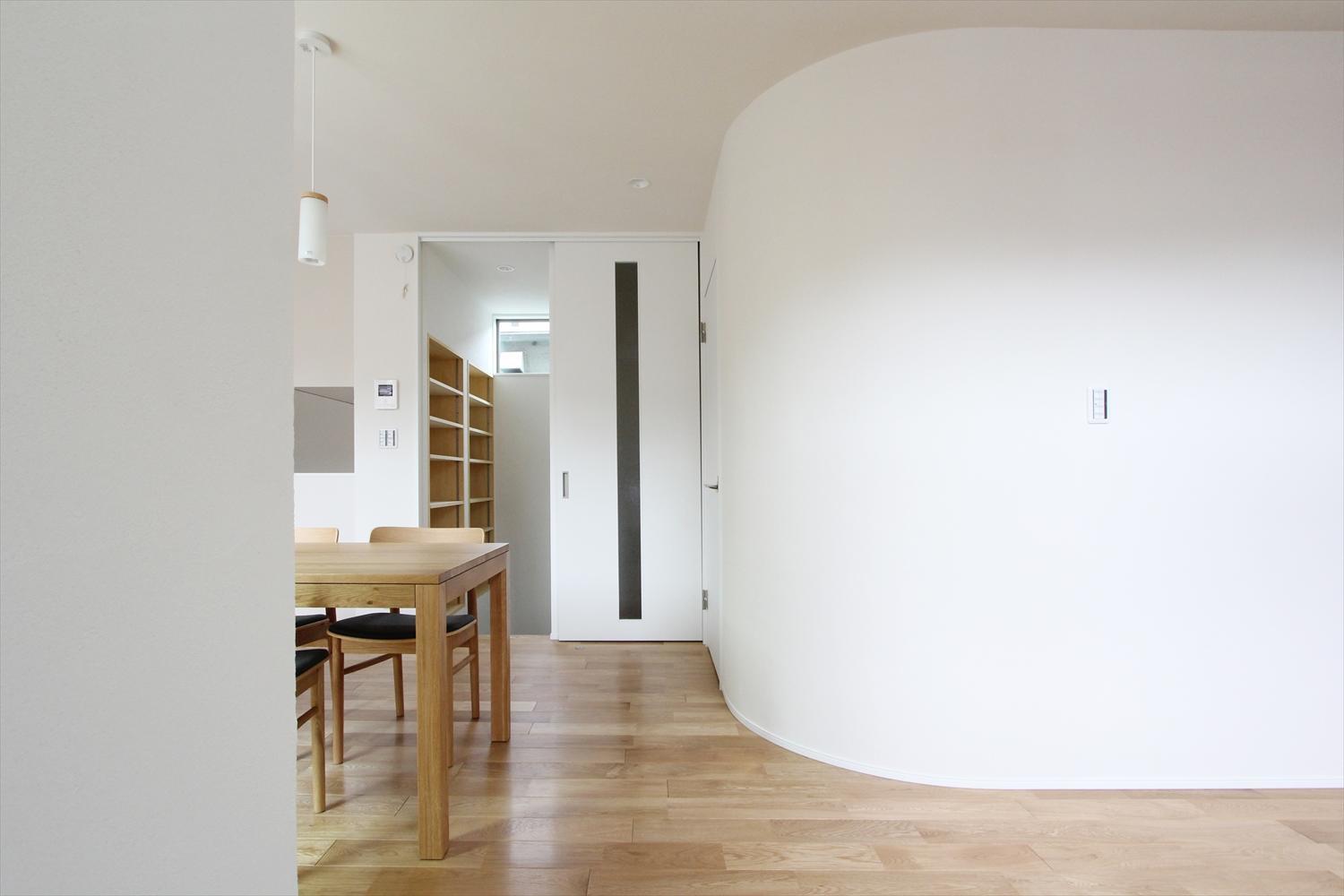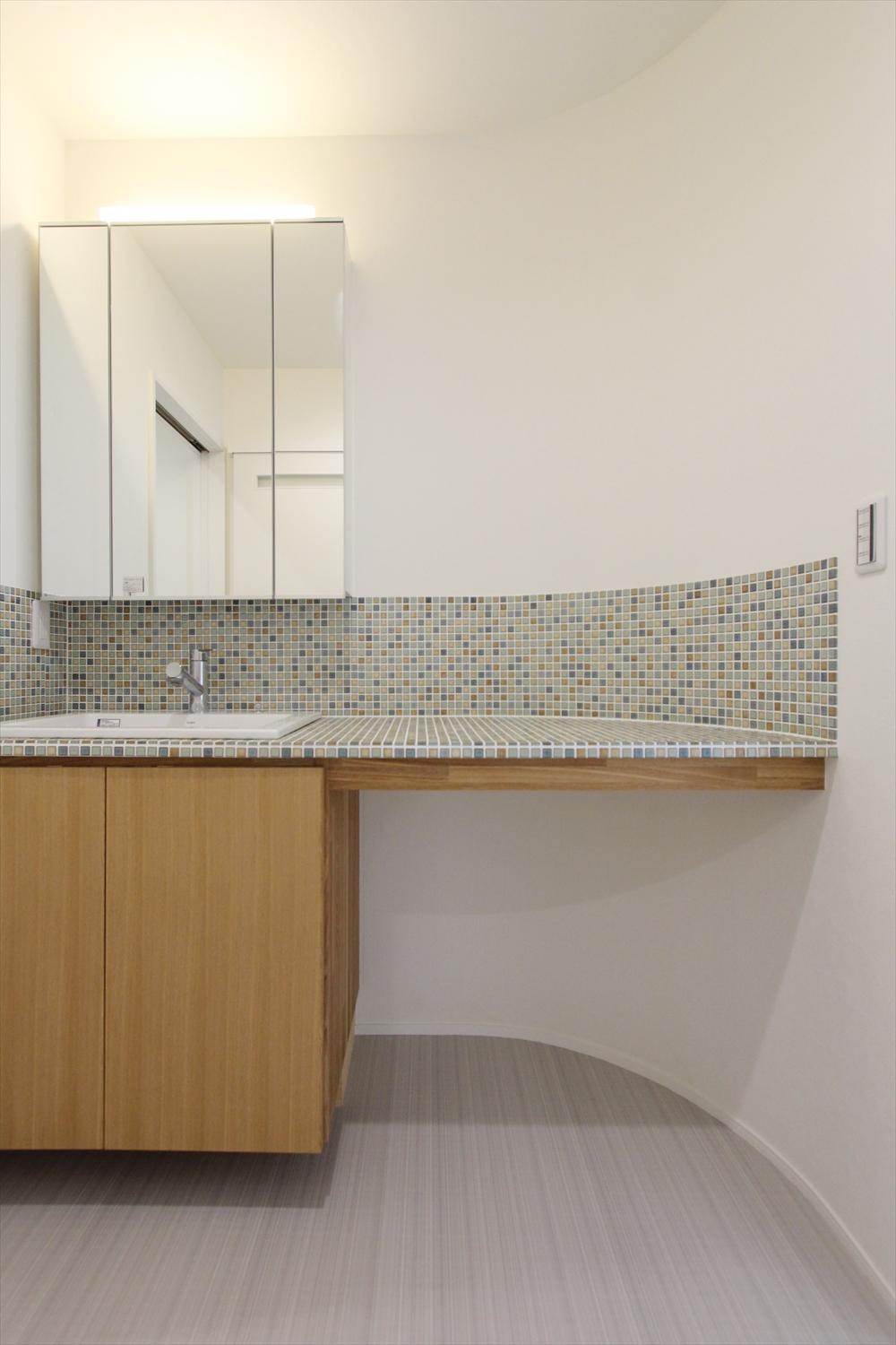 R壁の裏側は洗面脱衣室となっており、造作の化粧台のカウンターを曲線で仕上げています。一見すると簡単そうにみえますが、タイル職人の技術が光る仕上げです。カウンター下の右側半分がオープンになっているのは、奥様がイスに腰かけてお化粧をしたり、洗濯カゴを置くためです。
