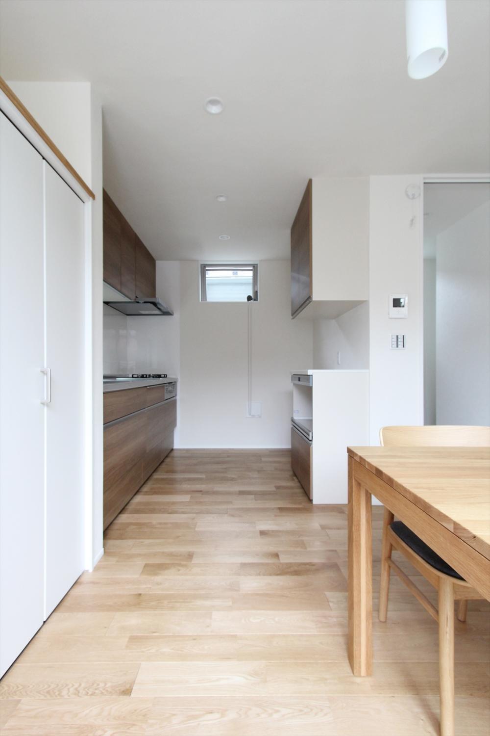 調理家電を収められる壁付けのキャビネットを備えた、シンプルなキッチンスペース。キッチンとキャビネットの面材を同色に仕上げることで空間全体に統一感が生まれました。ここでもハイサイドに窓を設け、採光の工夫をしています。