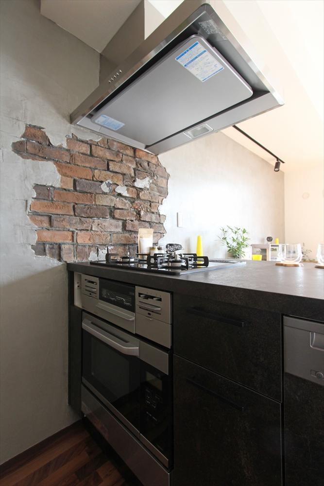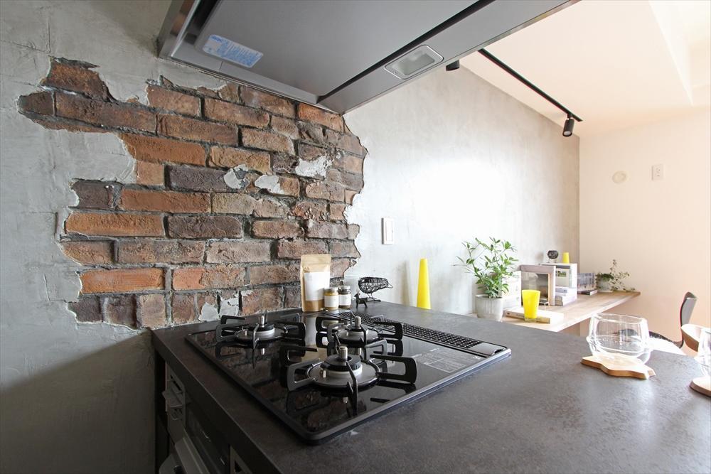 今回、オーナーファミリーが何より楽しみにしていたのが、キッチンの壁に表現したデザインコンクリート。レンガとモルタルをミックスした立体感のある仕上がりになりました。すべてフェイクですが、近くで見てもまるで本物と見間違えるほど、細部の作り込みはまさに職人の技術力の集大成。本来のレンガを壁に張る場合、どうしても壁が厚くなるのですが、このデザインコンクリートであればフラットに近いまま、効果的に立体感の演出が可能です。どんなカラーで、どんなデザインで、どんな表現をするか、細かなお打ち合わせを進めながら、最終的にこの表現に決まりました。某テーマパークや商業施設等で多用されるこのデザインコンクリートが暮らしのなかにあることで、日常のなかに非日常が生まれます。あえて、コンロの近くにレンガ調のデザインをしたのは、油汚れが目立ちにくくするためで、腕の立つ洋食屋の厨房のイメージをそのまま表現しました。なお、デザインコンクリートにの表面にトップコートを重ねることで、汚れに対する耐久力をアップさせている点もポイントです。