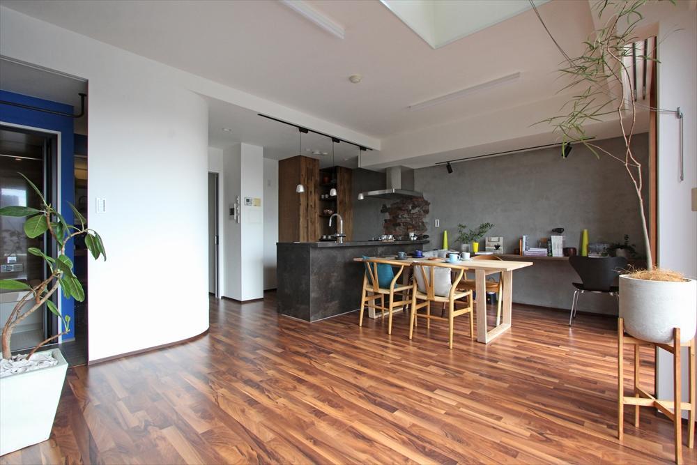 キッチンメーカーのショールームより紹介をいただき、ご縁を頂きました。 インダストリアルが好きなお客様。 こちらでできる限りの商材を探し、またお客様の方でもたくさん調べて頂いて、 コーディネーターと打合せをしてつくりました。 施工中もたくさん会話をさせて頂きました。 デザインコンクリート仕上げも快くご了承を頂き、施工することができました。 弊社にとっても大切な施工事例の一つになりました。 お子様との生活は当然考えますが、まずご夫婦がどう過ごしたいのか。 ということに重きをおきながら間取りを考えられていたと感じます。 子供が独立すれば、また夫婦二人の生活が始まります。 将来にわたり変化していく間取りになったのではないかと思います。 ご夫婦の夢はまだ始まったばかり。 次は戸建てに住みたいという夢を追いかけています。