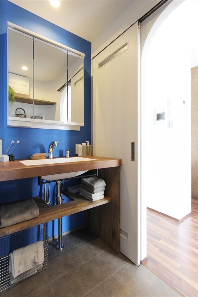 朝の身支度で洗面まわりの渋滞緩和をご希望された奥様のために、洗面スペースへのアクセス経路を2箇所設けた回遊できる動線を設計。キッチン側の経路はLDKのR壁にあわせて上部を丸型に仕上げました。曲面の施工は大工の技術によって仕上がりが左右される、難易度の高いデザインです。洗面台の背面には、R壁の内側に沿って角を丸めた棚を。人の行き来が集中しやすい箇所だけに、棚の角にぶつからないよう配慮しました。洗髪にも対応した深型の洗面ボウルとホースタイプの吐水口の水栓金具を備えています。ボウルは継ぎ目のないシームレスなデザインを採用することで、お手入れのしやすさも重視しました。カウンター下にはタオルバーや棚を設けることで、洗髪時の使い心地にこだわったオリジナル洗面台となりました。アクセントカラーには、ビビッドなブルーをチョイス。毎朝、鏡に向かうたびに、フレッシュな気持ちにさせてくれる空間です。