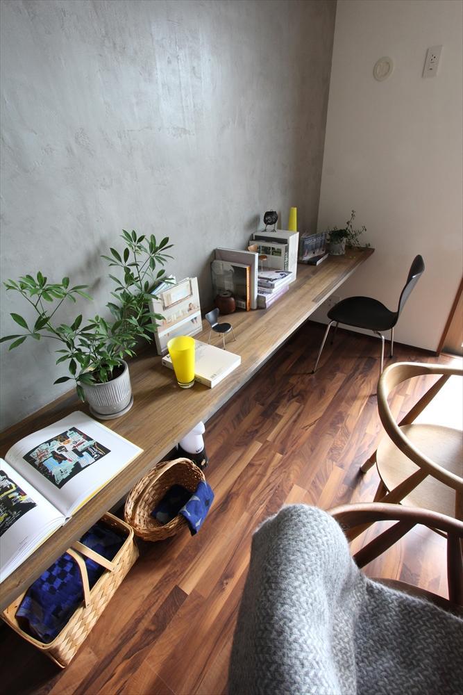 ダイニングの壁面に沿ってカウンターを設計。テレワークやお子様の勉強スペースとして、家族全員で並んでも十分なスペースを確保しました。