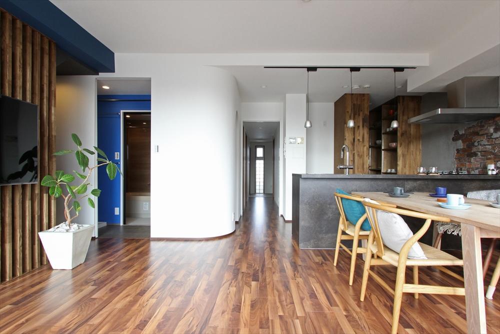 今回のリノベーションで一番のポイントは、このリビング&ダイニングでした。小学校に上がるお子さまとの3人暮らしを楽しむことを重視されていたオーナーご夫婦。十分な部屋数があるものの、家族ができるだけ各部屋にこもることなく、リビングに3人が集まり、時には一緒に、時には思い思いに楽しめる空間を目指しました。「家族みんなでゆったりテレビを見られる空間と、お子さまにとって秘密基地のようなスペースがあったら嬉しい」というご主人、「テレワークで仕事をするワークスペースとダイニングTV、ソファでくつろげるスペース、3つの機能をすべて満たしたい」という奥様、そして「いつも子どもが目の届く空間」をお二人とも望まれました。そんな想いをカタチにしたのが、全フロアを見渡せる階段スペースの壁面をアクセントの格子にし、TVを掛けることで、カウンター、ダイニングテーブル、ソファのどこからもベストビューを実現。しかも格子の裏には、秘密基地のようなキッズスペースも。奥様のご希望だった、ゆったりとソファから窓越しの花火が楽しめる、そんな空間を叶えました。床材には、床暖房対応のぺルゴ(ベルギー製)のウォルナットカラーを採用。糊や釘を一切使用せず、簡単に施工できる点が特長です。2020年、東京オリンピックでも床材として採用されるこの商品は、傷がつきにくく、汚れを落としやすい機能性の高さに注目が集まっています。全体のトーンはグレー、ウォルナットのビンテージ感のあるダークトーンに。アクセントにはオーナーご夫婦が大好きなダークブルーを効かせ、テクスチャー感のある素材をミックスすることで、より深みのある演出を心がけました。また、もともと広いLDKですが、壁の一部をR壁(曲面)で仕上げることで、さらに広がりがプラスされています。
