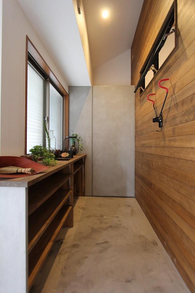 「ロードバイクを飾りたい」というご主人のリクエストと、「靴の収納場所と背の高い物入れが欲しい」という奥様のご要望、そしてご夫婦共通の「ビンテージ感のあるダークなカラーコーディネート」をおうかがいしました。そこでオススメのデザインコンクリートで、壁と床をモルタル調に。バイクを飾る壁面には、アクセントでヘム材のシングルパネルをウォルナット色に塗装。抜け感を出すために、隣りの部屋につながる内窓をハイサイドにレイアウト。採光、通風にも役立ちます。