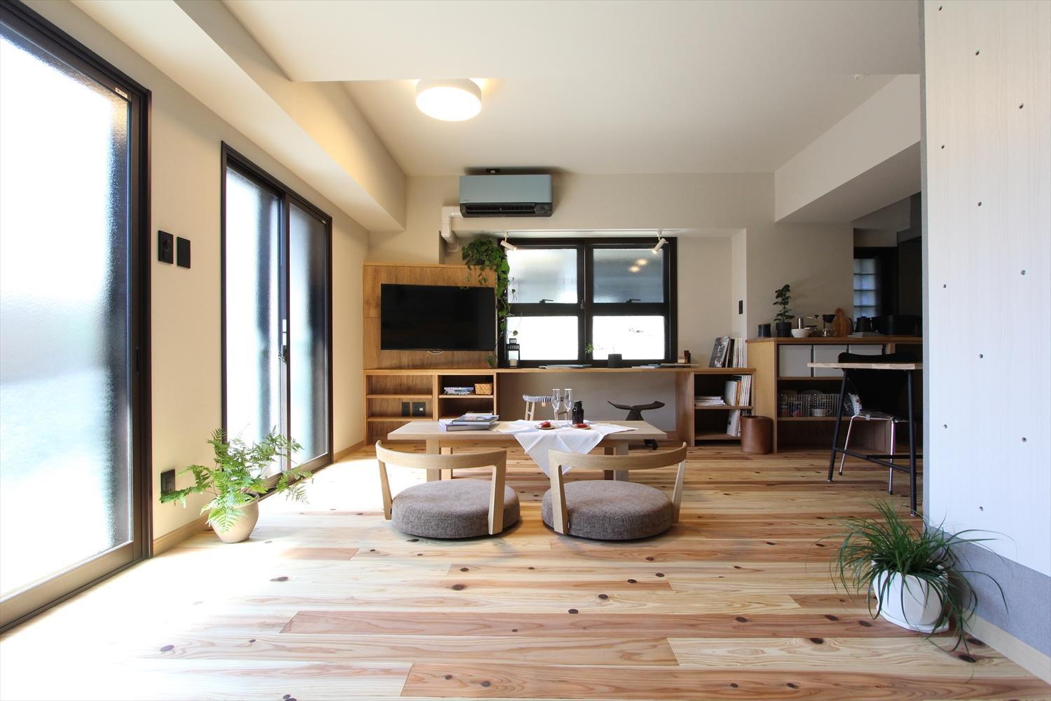 ダイニングと子供部屋の中間スペースにあたるリビングスペース。どこからも見やすいように配置されたTVボードをはじめ、スタディカウンターと一体となった収納など、空間に最適化された造作家具が見どころです。