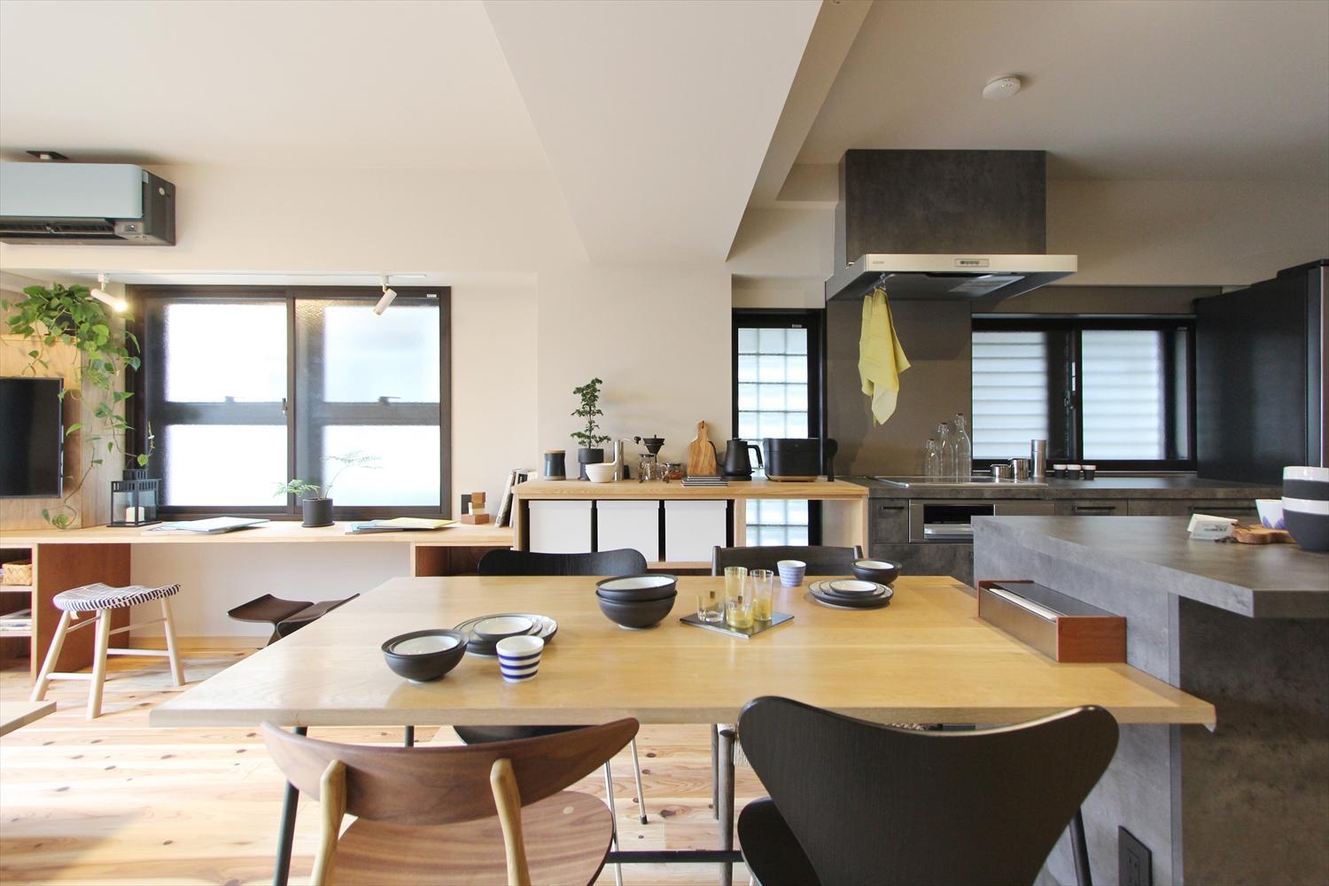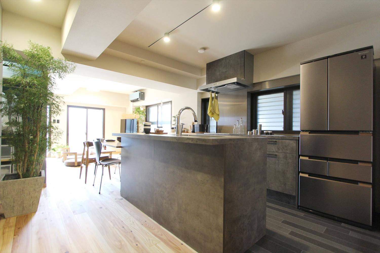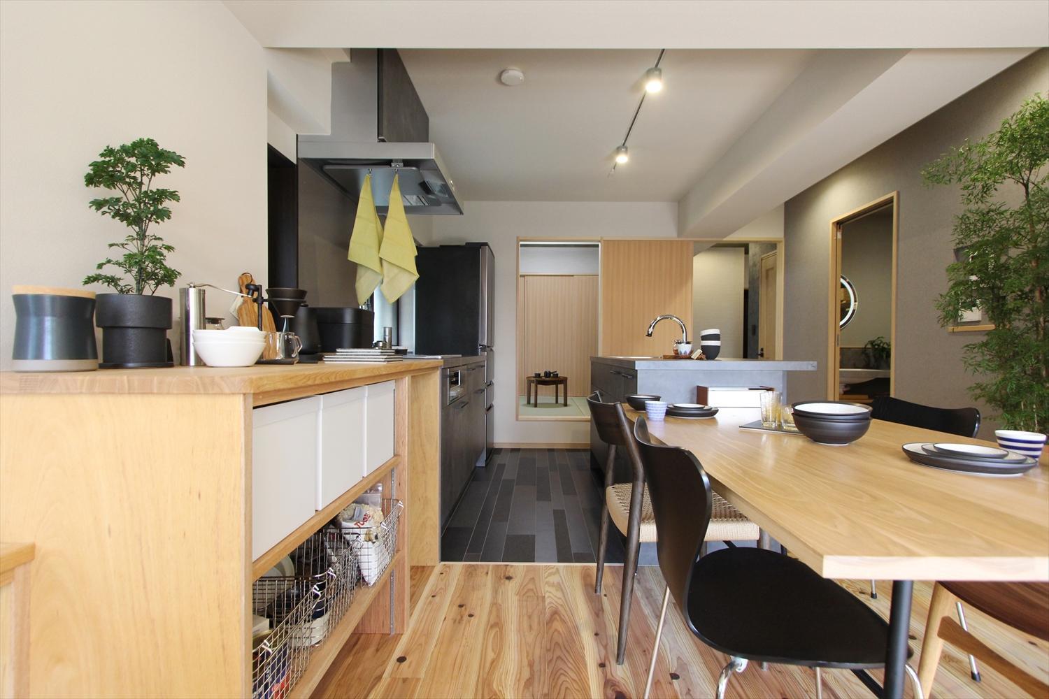 スタイリッシュなデザインで統一したキッチンエリアは、グレーを基調に仕上げたオーナーこだわりの空間です。GRAFTEKTのキッチンに採用した「ベトングレー」と、フロアタイルの「ダークグレー」が絶妙にマッチ。奥の和室とも相性のいい落ち着いた色味でコーディネートしました。休日はご夫婦一緒に料理を楽しめるレイアウトに。