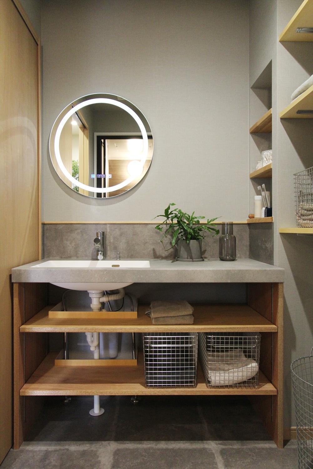 造作の洗面スペースは、床、カウンター、壁をグレーに統一し、相性の良い木目を組み合わせ、落ち着いた印象でありながら重たくなりすぎないようにまとめています。