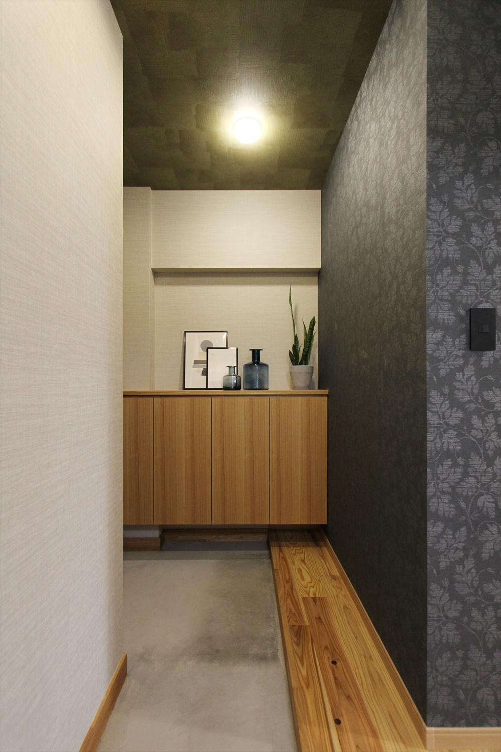 既存マンションの玄関にありがちな狭い空間を一新し、広々とした使いやすいスペースを意識したレイアウトにアップデート。土間に降りることなくシューズボックスまでアクセスできるようフロア部分を延長している点が特徴です。シューズボックスは床から上がったデザインにすることで、開放感を演出するとともに、濡れた靴や屋外で使うアイテムを収納できるように設計しています。収納の一部は傘などの長さがあるモノも収めることができ、生活感が出ないよう配慮しました。玄関ドアを開けて正面に見えるアクセントクロスは、オーナー自らセレクトしたもの。また、玄関から和室までつながる天井は「和」の雰囲気を大切にしたデザインの壁紙をチョイスしました。