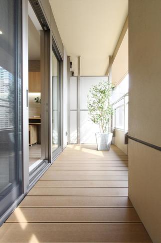 飾り気のなかったバルコニーは、耐候性に優れた樹脂製のデッキを敷いて見た目をアップデート。フラットな仕上げにすることで、部屋からの出入りが簡単に。