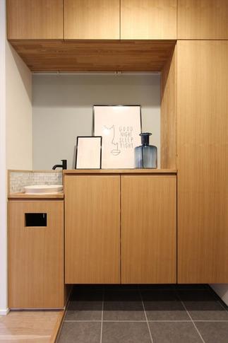 洗面台は機能性に優れたLIXILのルミシスをセレクト。それに合わせて、無駄な隙間が生まれないように造作の収納を組み合わせて、限られた空間を有効利用したスペースを叶えました。収納の一番下は洋室同様、ロボット掃除機のベースとなるよう、配線などの設計をおこないました。