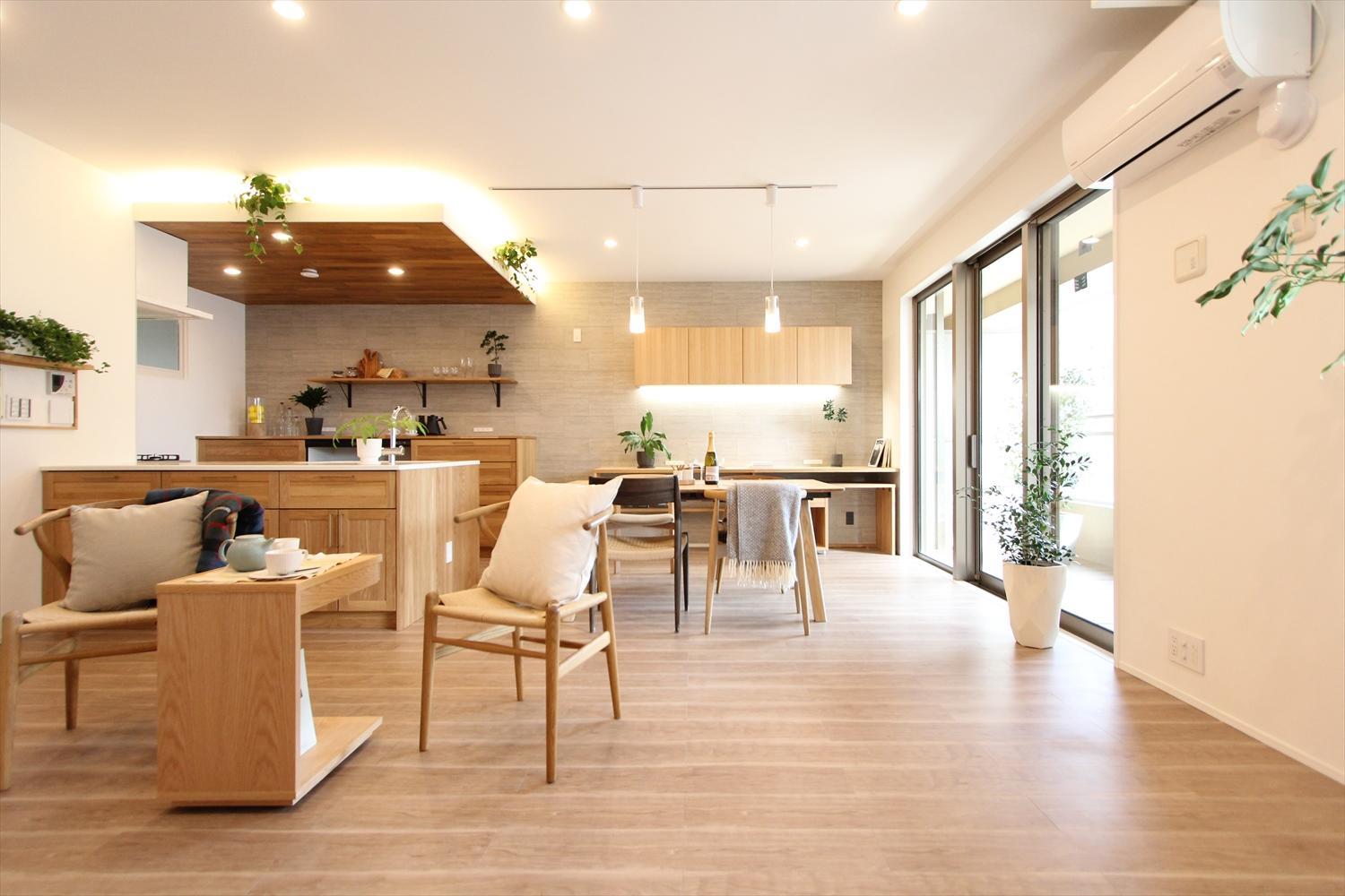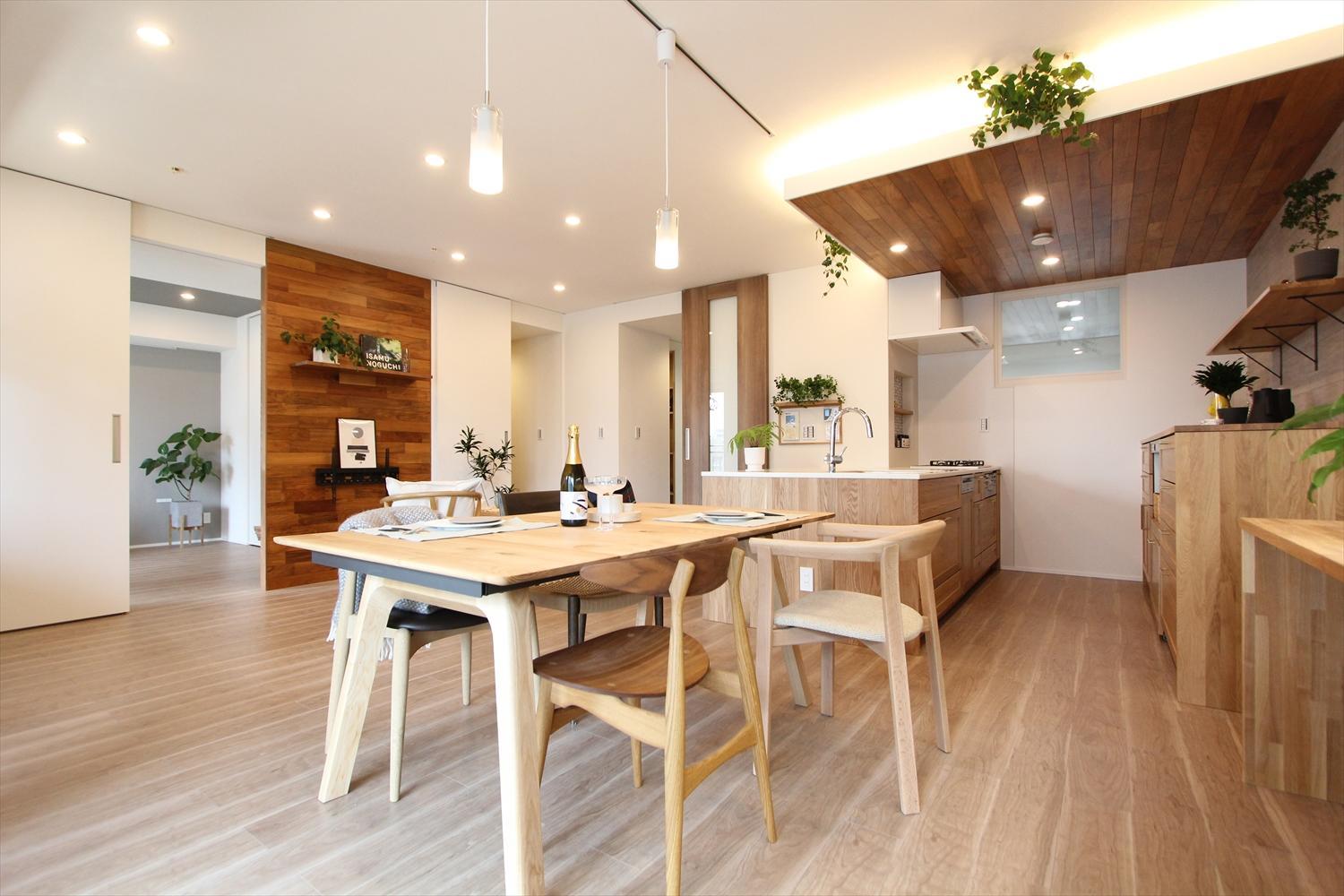 オーナーご夫婦ともに好きな「木」をベースに、それぞれ好みのテクスチャーを採り入れた内装コーディネートが、今回のリノベーションの大きなコンセプト。リビングの壁やキッチンの天井には木目の美しいチーク、面材が木目になっているウッドワンのキッチンなど、色々な種類の「木」を一つの空間のなかに採用しているため、それぞれが混在して散らかった印象にならないよう、木目以外は白でまとめて統一的なトーンマナーになるよう心がけました。チーク材を張ったキッチンの天井は、一段下げて間接照明を入れている点が特徴です。