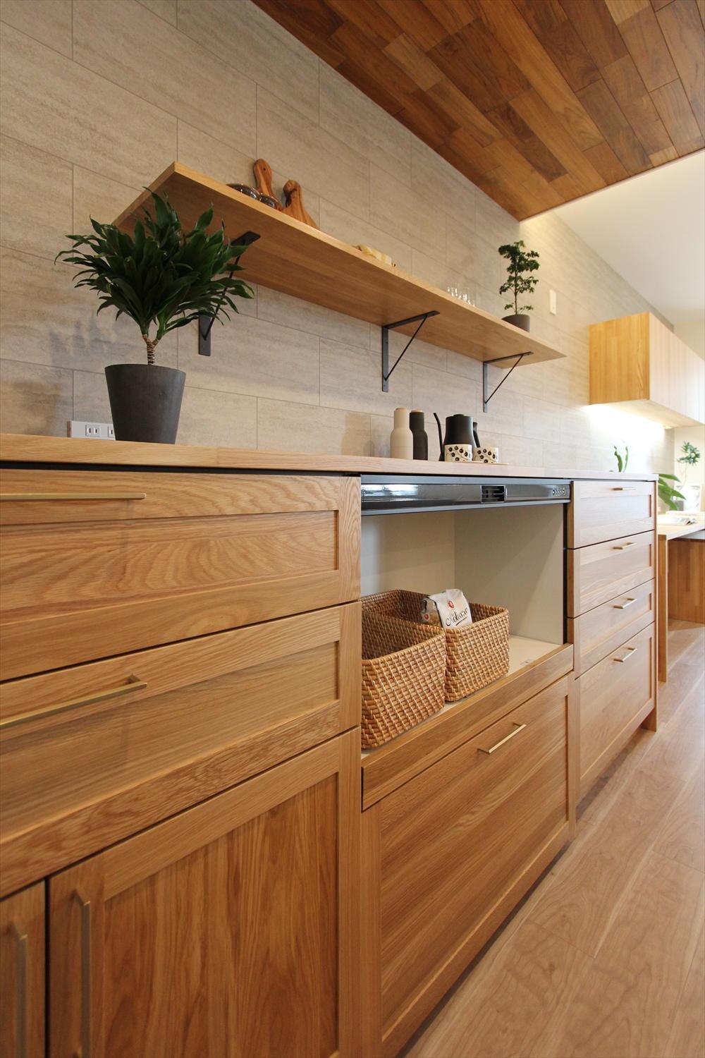 キッチンとバックセットは収納量とデザインを重視して、WOODONEのスイージーをセレクト。天井に張ったチークとの組み合わせが美しい空間を叶えました。奥様がこだわったニッチスペースは、お気に入りのタイルを採用した個性的な仕上がりに。
