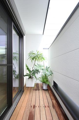 1階の寝室は窓を大きく設け、光をふんだんに採り入れる設計に。ただし、窓の大きさとプライバシーの確保は常にトレードオフの関係にあることから、隣家からの目線をしっかりとシャットアウトする工夫が求められました。そこで、高い壁で囲われた中庭をデザインすることで、プライバシーと採光を両立。あわせて、部屋の床と中庭のウッドデッキの高さをフラットに揃え、出入りの際の動線がスムーズになるよう配慮しています。クローゼットの建具もKamiyaのフルハイトドアを採用し、開放的な空間演出と、最上段の棚まで無駄なく使える仕様に。