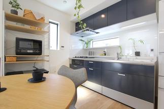 斜線制限による屋根形状に合わせる形で、キレイに収めたキッチン。限られたスペースを有効活用しながら、キッチンが孤立しないよう、暮らしに溶け込むレイアウトとなっています。家事をしていてもダイニングやリビングにいる家族と緩やかにつながっていられる、そんな暮らしをイメージしました。また、正面には心地の良い光が入る窓と、造作の棚を設け、明るさや使い勝手に対する配慮をしています。さらに、洗濯機をキッチンに近い場所に配置することで、家事集約型の動線としている点も重要なポイントです。洗濯機スペースは建具で閉じることもできるため、音や見た目が気になる問題もバッチリ解消です。