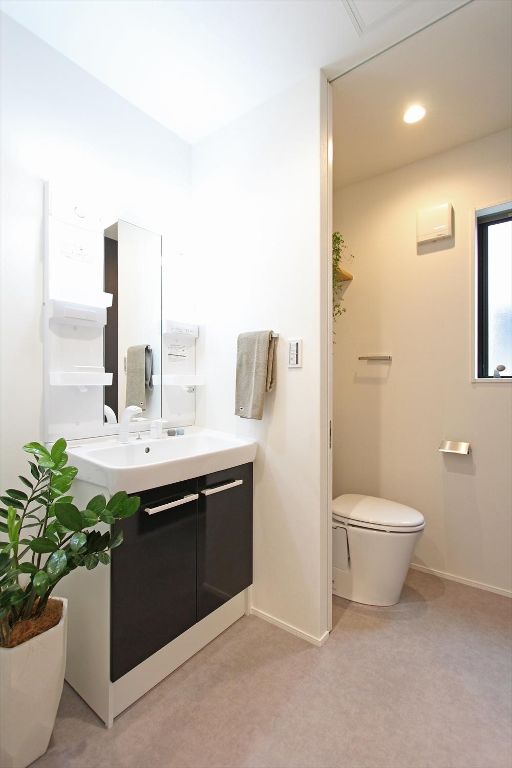 バスルーム、トイレ、洗面脱衣室は使いやすくお手入れがしやすいシンプルな設備をチョイス。明るい色味のデザインで、毎日の気分が上がるものを意識しました。既製品が使いづらいトイレの中の収納は、ニッチや棚を造作することで、収納量を確保しています。また、各エリア間のスムーズな移動をイメージして、動線が短くなるよう設計。無駄のない暮らしを支えています。