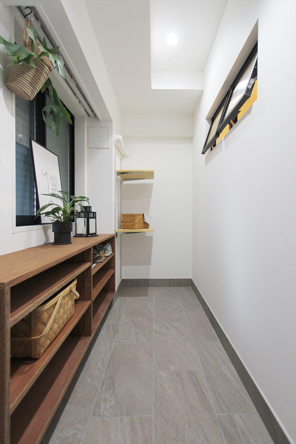 もともと洋室だった空間を間仕切り、玄関からつながるエントランスへと拡張しました。シューズボックスは造作で仕上げたオリジナルで、床から浮かせたデザインにすることで、空間に広がりを与えます。また既存の窓に加え、子ども部屋との壁に内窓を設けることで、採光と採風も意識した設計となっています。エントランスの床はお手入れのしやすいタイル仕上げに。