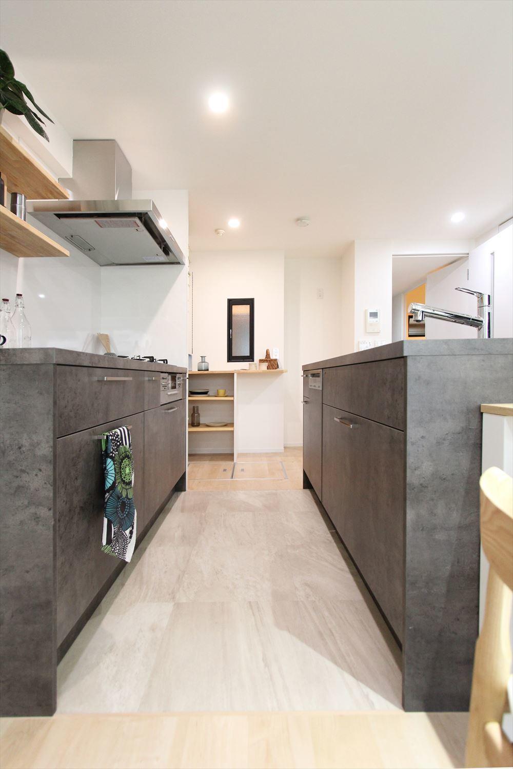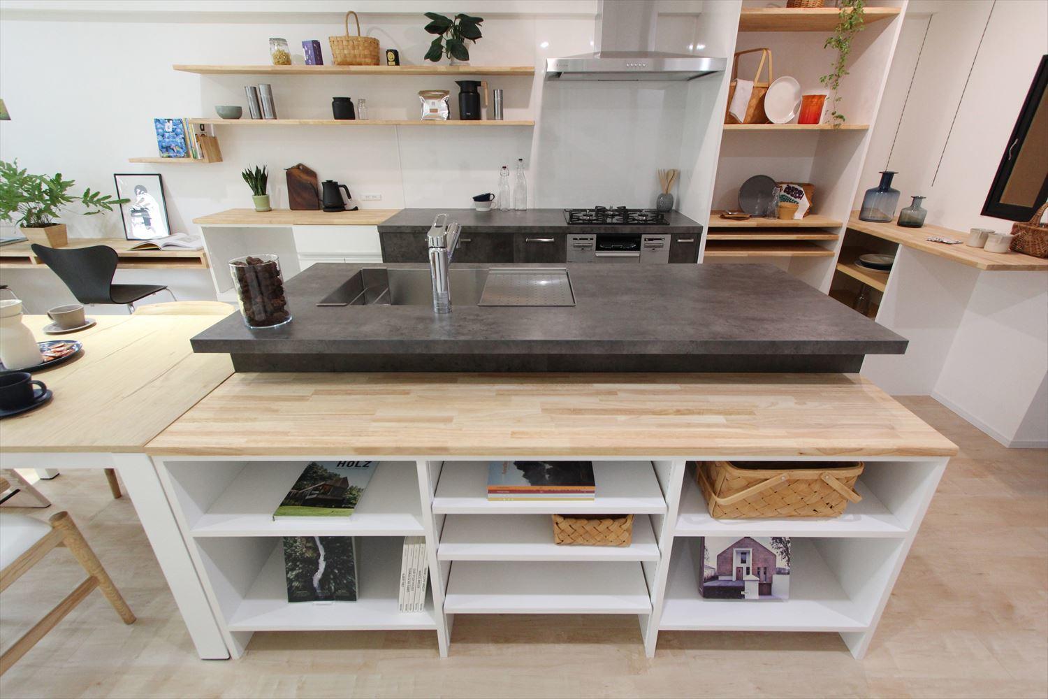 キッチンはメラミンの天板が特長のGRFTEKTを採用。落ち着いたカラーリングで、LDKにマッチしたデザインとなっています。キッチンの形状はセパレートタイプとし、ご夫婦が一緒にキッチンに立てるレイアウトにこだわりました。キッチンまわりの収納も造作家具で仕上げているため、わずかな無駄もなく、ご家族の理想を叶えることができました。見せる収納用の棚も◎。