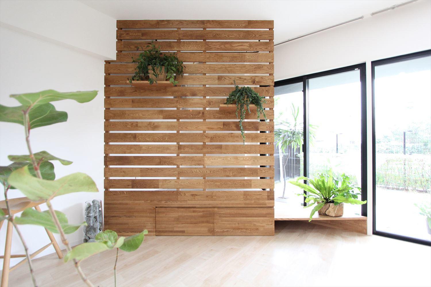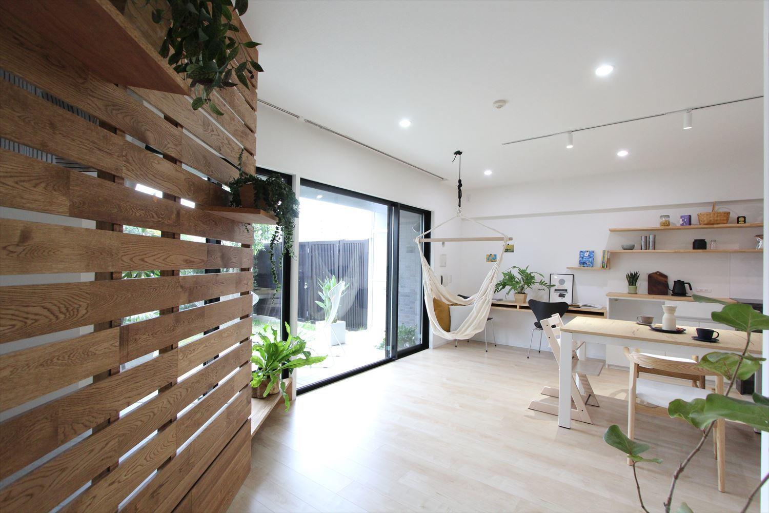 リビングは斜め方向にスペースの広がりを感じられるレイアウトとし、かつ空間を無駄なく有効活用できるアイデアを具現化しました。天然木をフェンスのように目透かし仕上げしたTVボードは、裏側から棚板の高さや位置が調整できる構造に。さらに裏側には部屋干し用のハンガーパイプを備え、急な雨にも対応できる空間になっています。ボードの一番下は引き出し収納として無駄なく活用できる点もポイントです。また、リビングの一角に簡易的なワークスペースと収納を設けました。