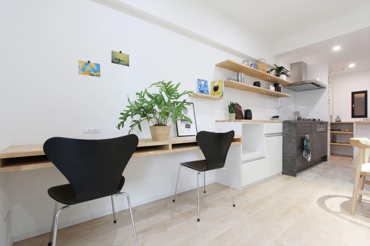 ダイニングキッチンの近くに設計したワークカウンターは、テレワークにもお子さまの学習にも最適なスペースです。十分な広さをとっているため、同時に作業をしても、それぞれ余裕をもって使うことができます。デスクの下には書類や冊子などを収めることができる引き出しも備えています。また、壁はマグネットが付けられる仕様になっているため、お気に入りのポストカードや、大切な書類を貼っておくことも可能に。