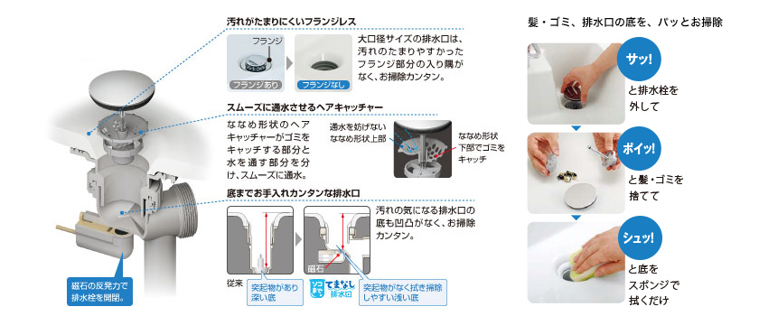 ソコまでてまなし排水口は、排水口の底部分に凹凸がなく、