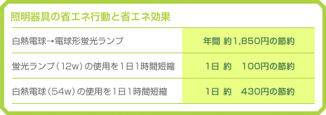 白熱電球を電球形蛍光ランプなどに取り替えると、かなりの省エネになります。