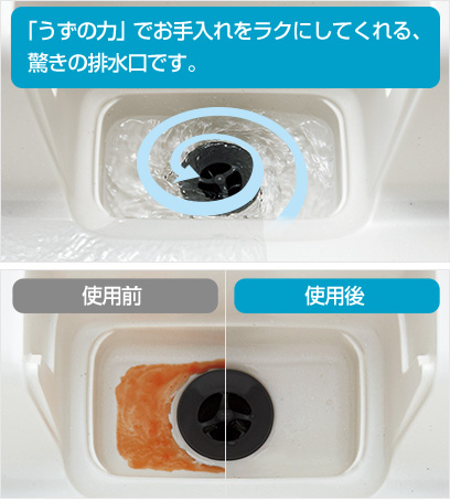 水を流すだけで、うず状の水流が排水口・ゴミカゴ裏面