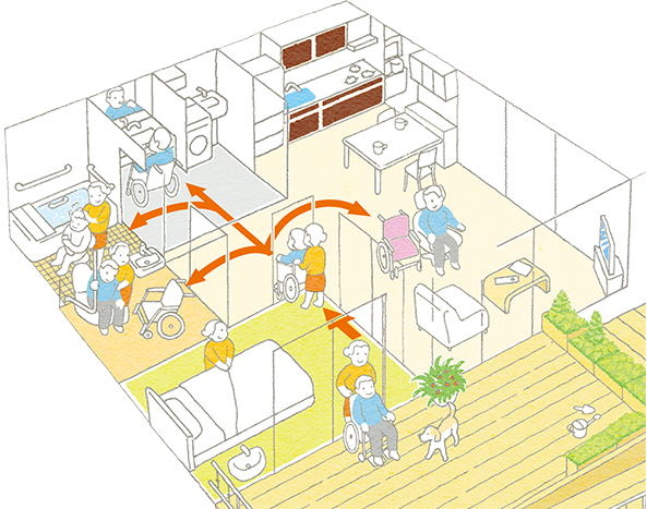 トイレや寝室などまわりの空間と行き来しやすくして、