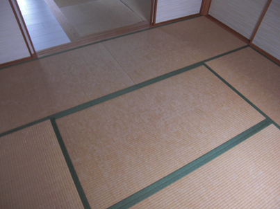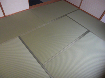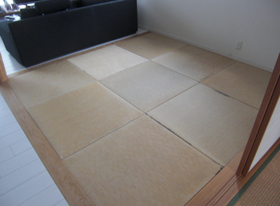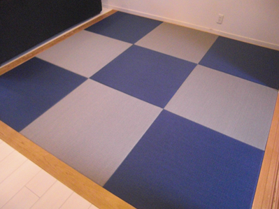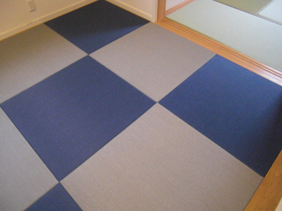 傷んできた畳の入れ替えをご希望。カラー畳を市松模様にして、スタイリッシュな和室へとイメージチェンジされました。また、続きの和室も縁の色が目立たないものを採用され、襖をあけていても違和感がありません。