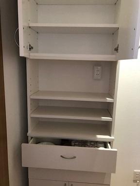 毎日使わない卓上コンロ・圧力鍋・食器 他、冷蔵庫に入れる迄もない野菜や果物等を収納する棚を作ってほしいとご要望がありました。 (既製品だとなかなか思うような物がないので) 引き出し・開き棚・オープン棚を組み合わせて作成!とても使い勝手が良く、キッチン周りのゴチャゴチャがスッキリしたと、大変満足していただきました!