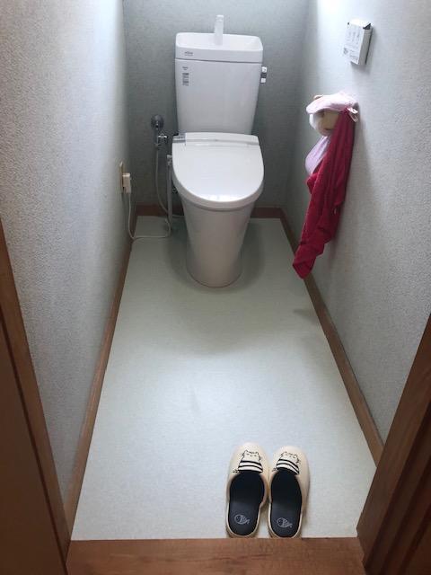 トイレの入れ替えと、床のクッションフロア貼り替えリフォーム。 フチレス形状で、お掃ラクラクな「アメージュZ」採用。 床の色も明るくなり、全体的にスッキリとした空間になりました。