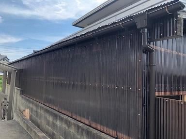 経年劣化で色褪せや、剥がれてしまった物置の壁板を張り替えリフォーム。 雨樋も取り換え、新しく扉を取り付けました。
