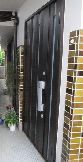昔ながらの重い玄関の交換リフォーム。 ひずみできっちり閉まらなくなってきていました。 元々の枠を取り外し、新しい枠を取り付けてドアを設置。 開閉も楽になりお喜び頂きました。