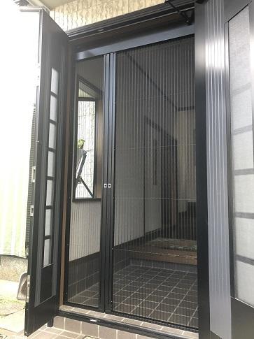玄関網戸設置リフォームをさせて頂きました。 枠を取り付け簡単施工! 不要な時は簡単に取り外せ、水洗いできます。 マグネットでピッタリ閉まるので、虫などの侵入も防ぎます。 自然の風を採り入れ、玄関内の空気もスッキリ!