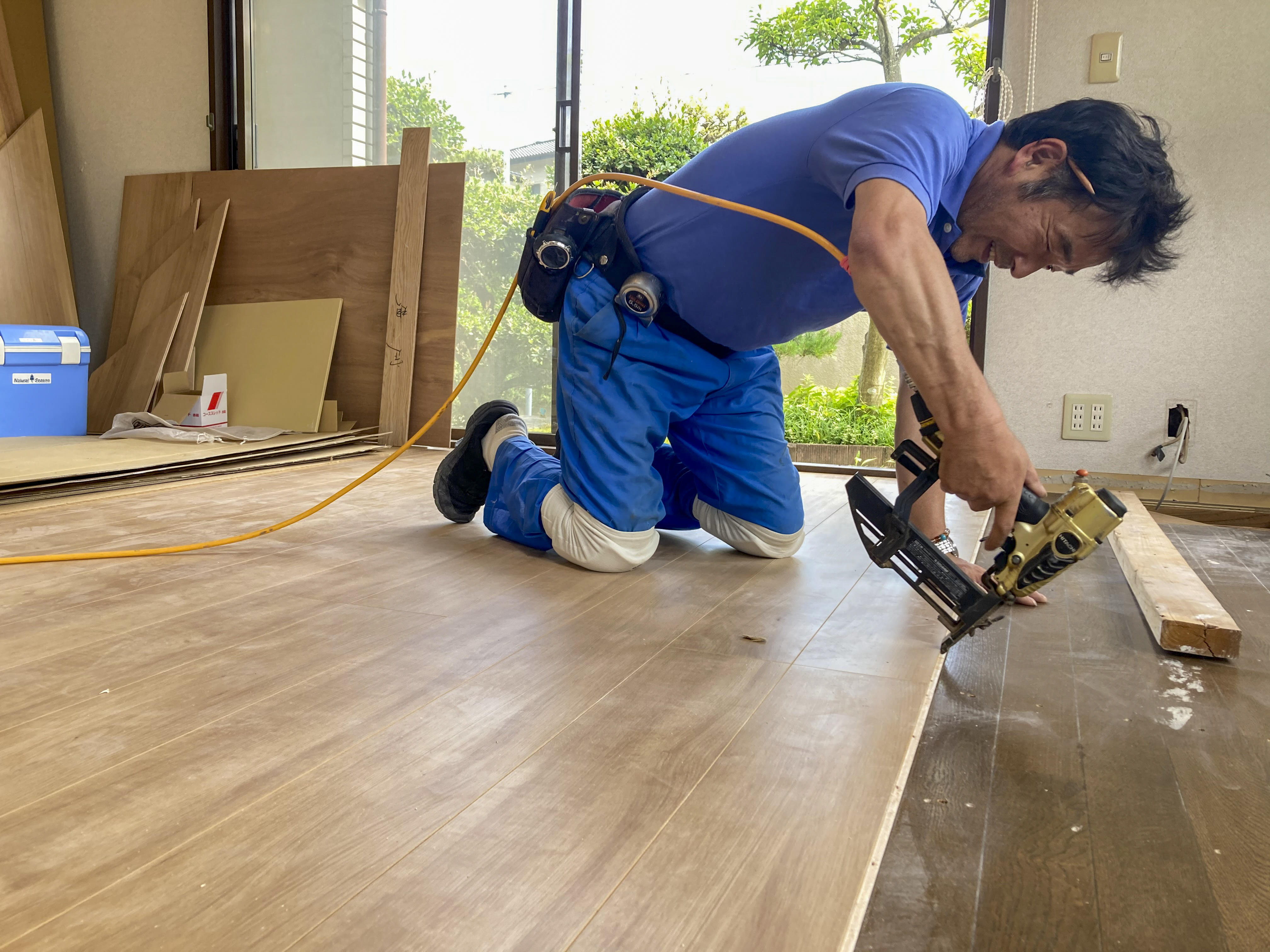 現在リフォーム工事が進んでいる現場に同行させて頂き、この日は大工さんが床材を貼る作業をしておられました。
