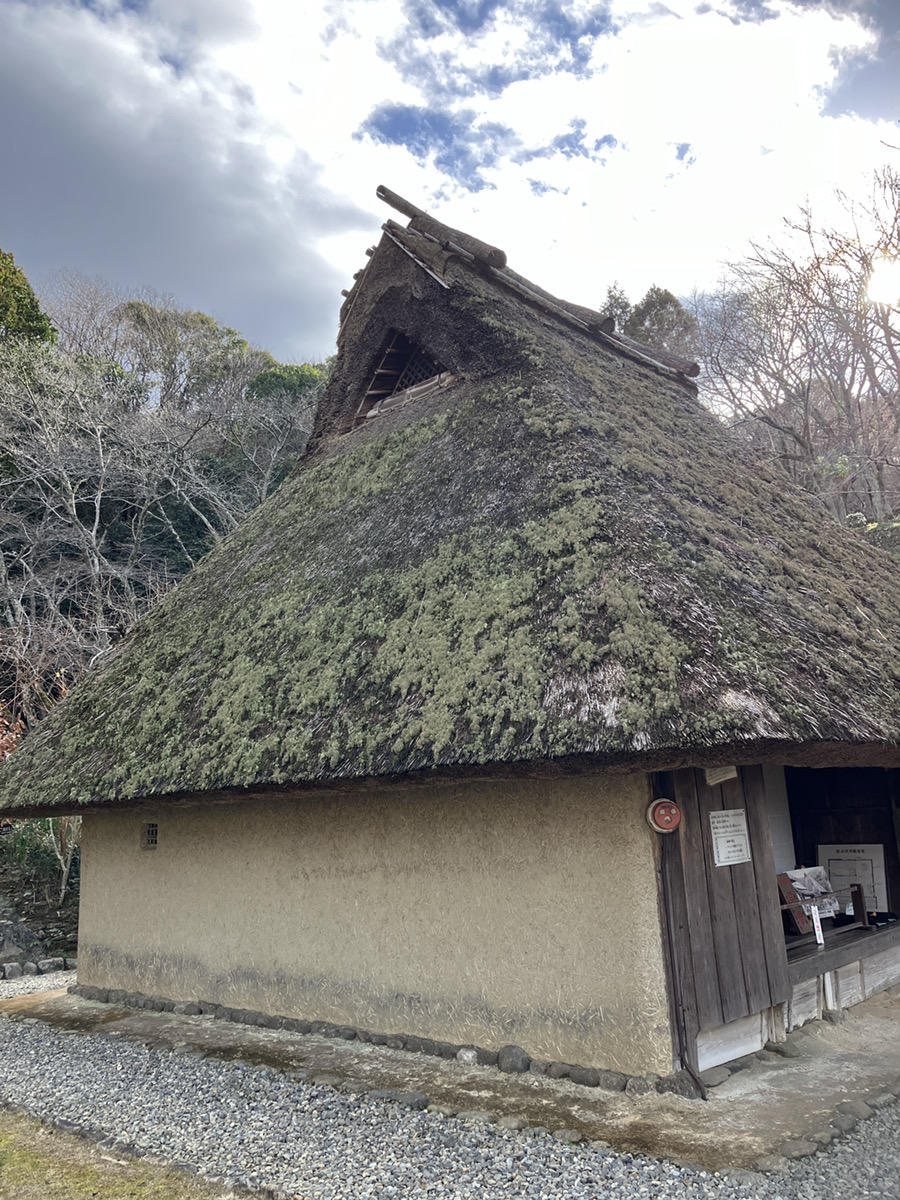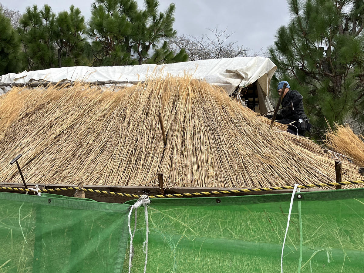きれいに整備された歩道を進むと展示している古民家があり、茅葺き屋根の葺き替えをやっていました。