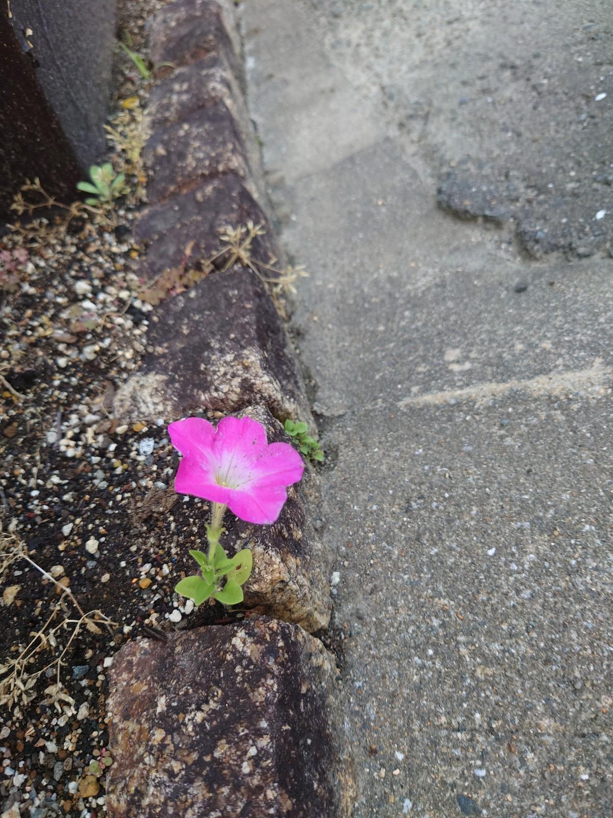 何気なく駐車場に向かって歩いて行くと、「ここに咲きました」と言わんばかりに一輪のペチュニア。