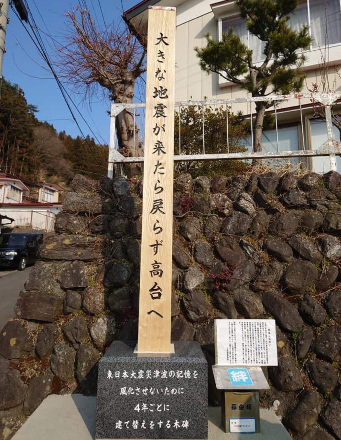 これで思い出したのが以前テレビのニュースで伝えていた岩手県大槌町の津波避難の木碑です。
