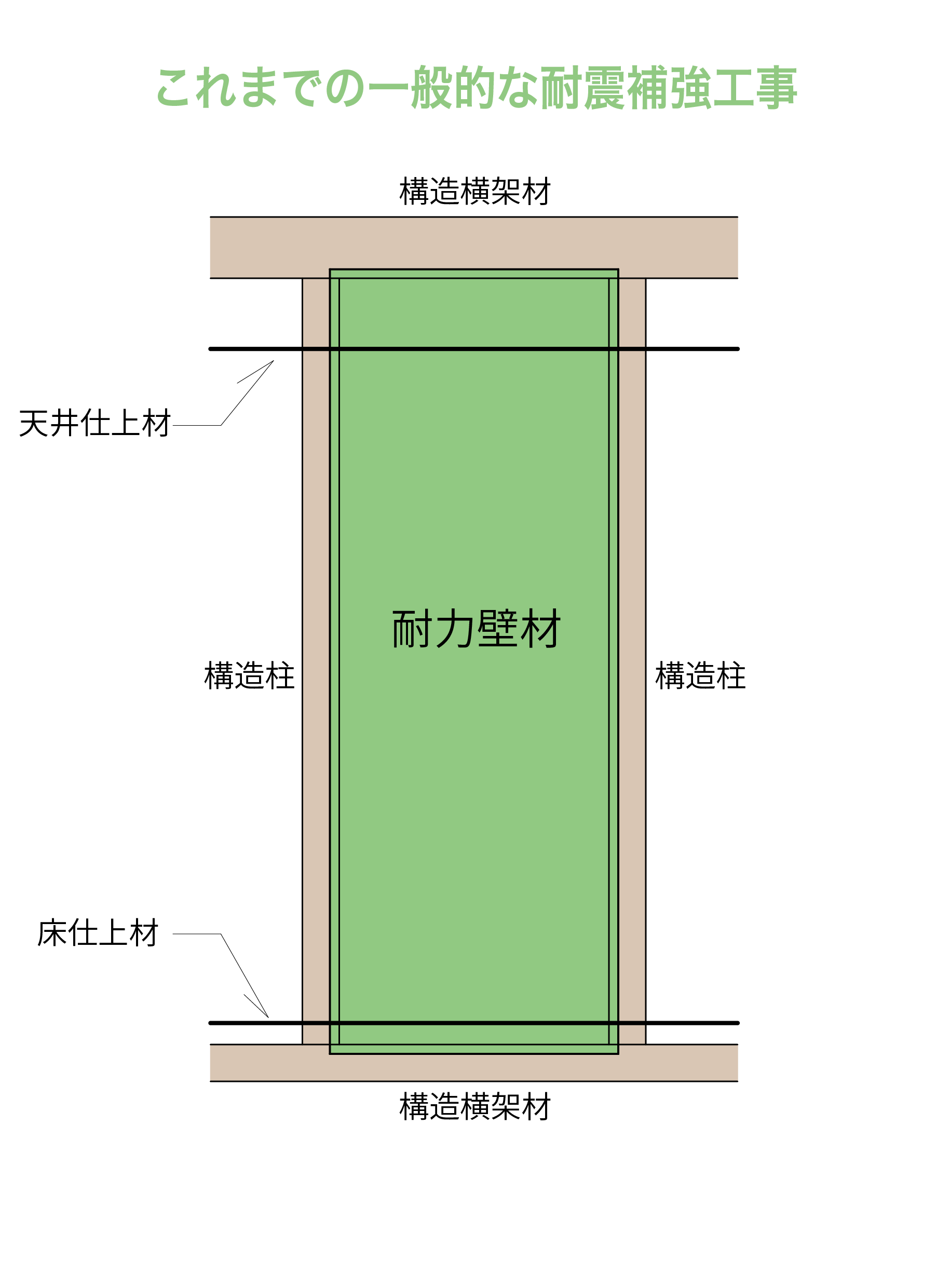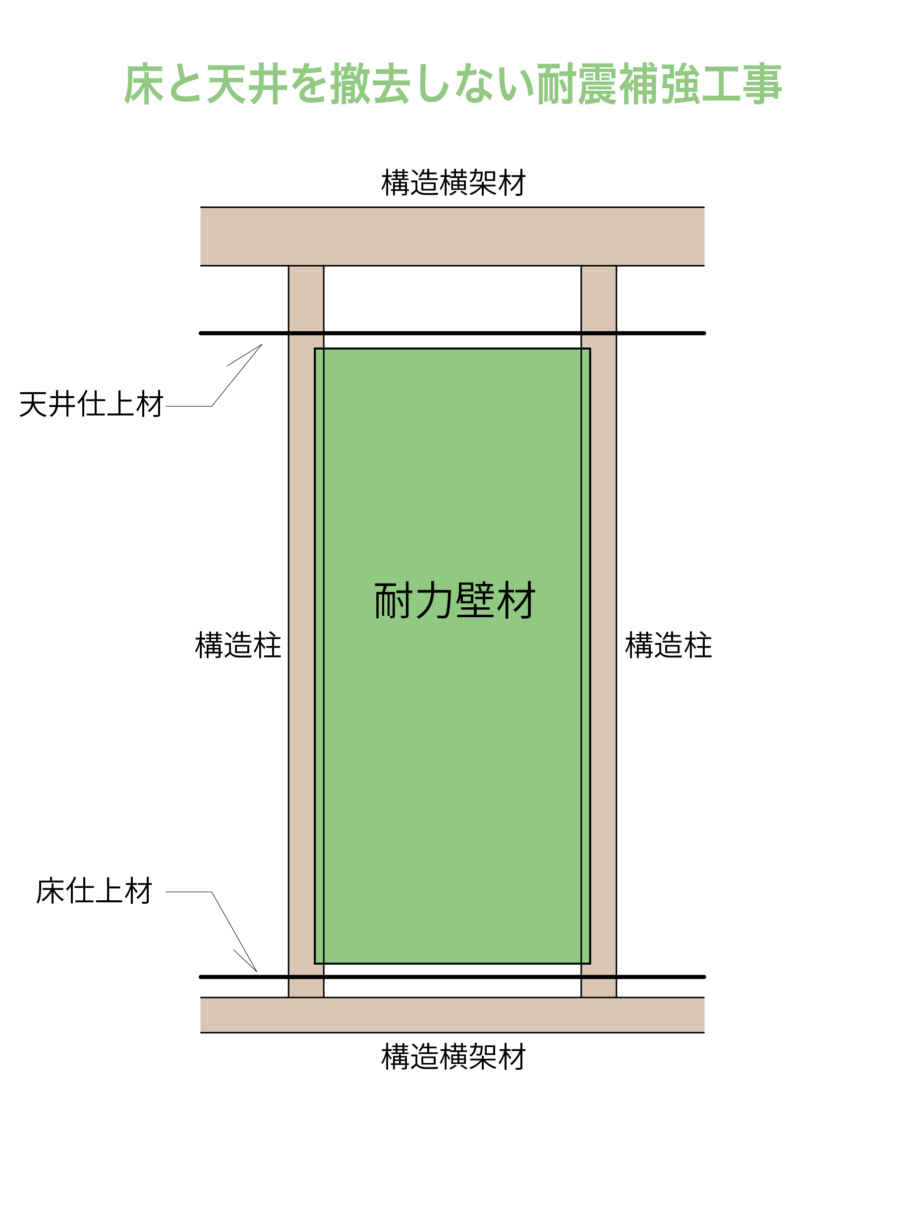 このように、壁を強くするために、上下にある「天井」や「床」まで解体して構造材(柱や梁)にアプローチする方法が一般的でした。これでは、耐震に関係のない部分まで直す必要があり、費用が膨らんでしまいます。