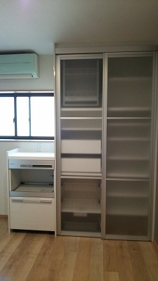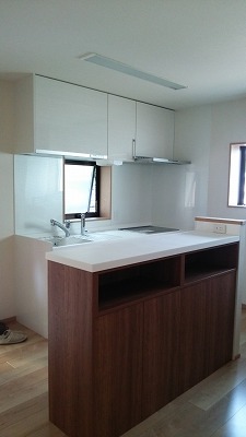 新しいシステムキッチンとその後ろ側に収納兼作業用の