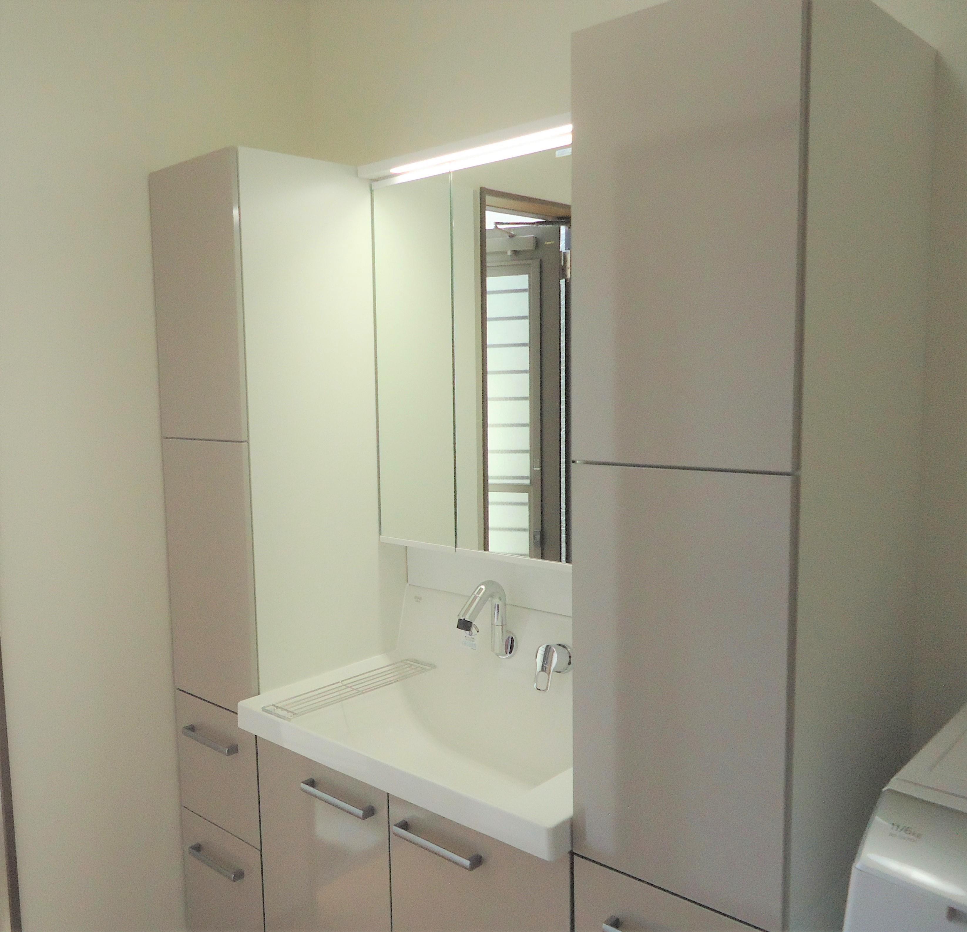 築18年が経ったお客様の洗面化粧台工事をさせていただきました。 LIXIL洗面化粧台ピアラに取り替えました。 洗面ボウルの底が広くて平らなので使いやすい洗面台です。 キャビネットも設置したので収納力もアップし、洗面化粧台横のスペースも有効活用できます。