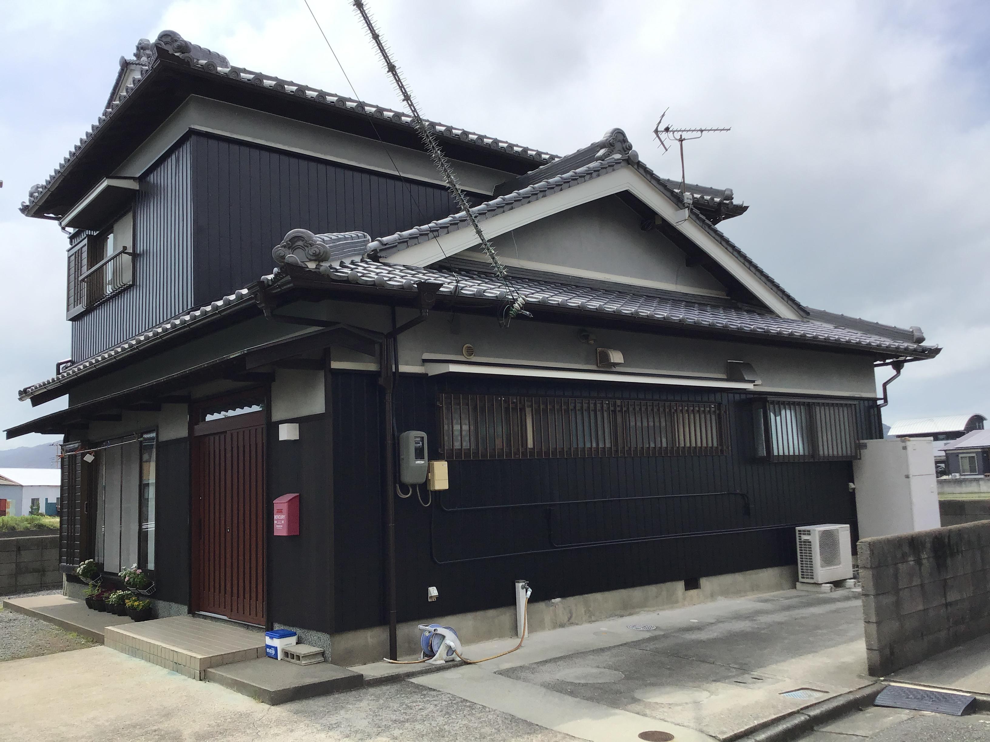 築30年のお家を外壁塗装と玄関ドア工事をさせていただきました。 外壁の色はご主人が選ばれ、全体的に黒色にされました。