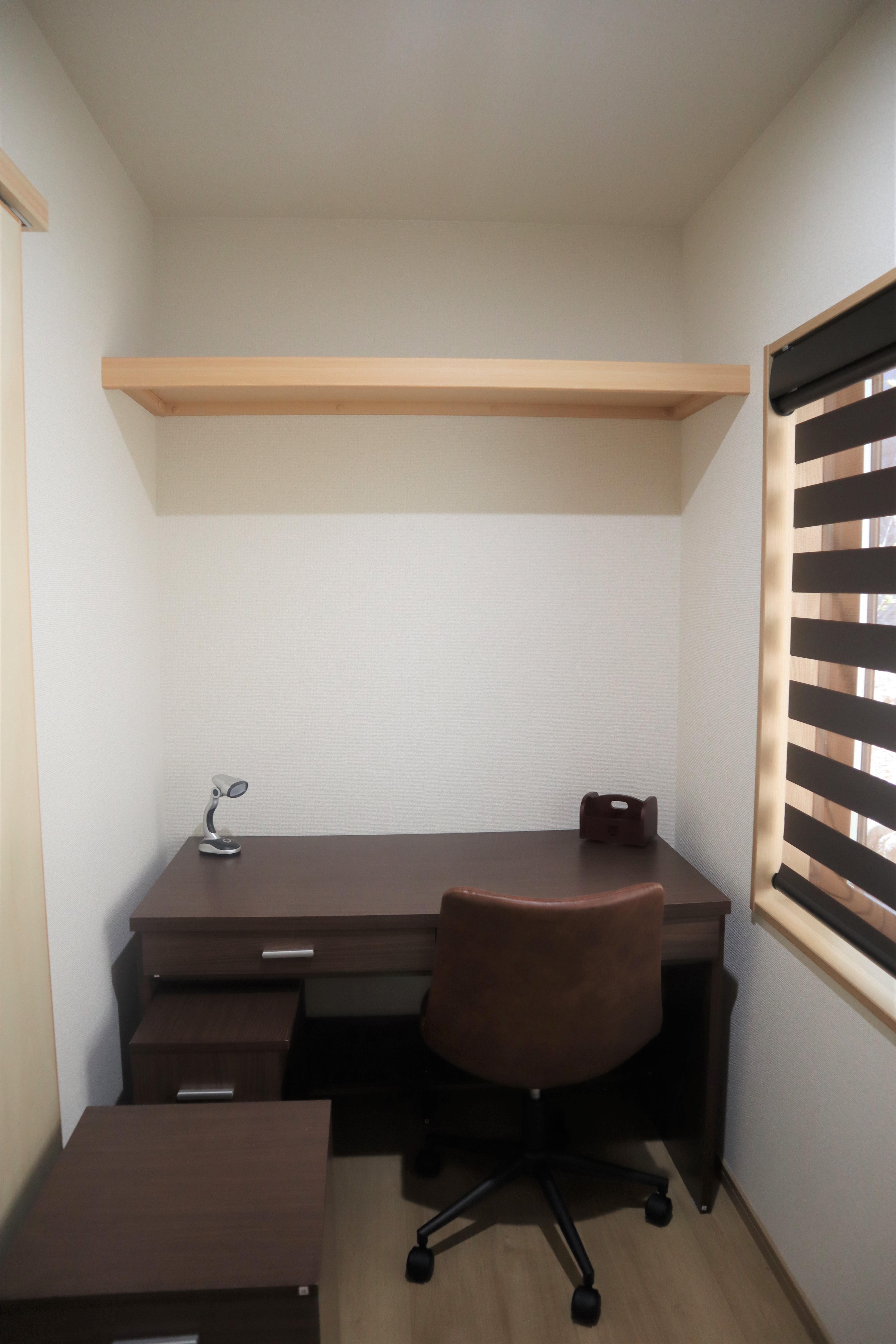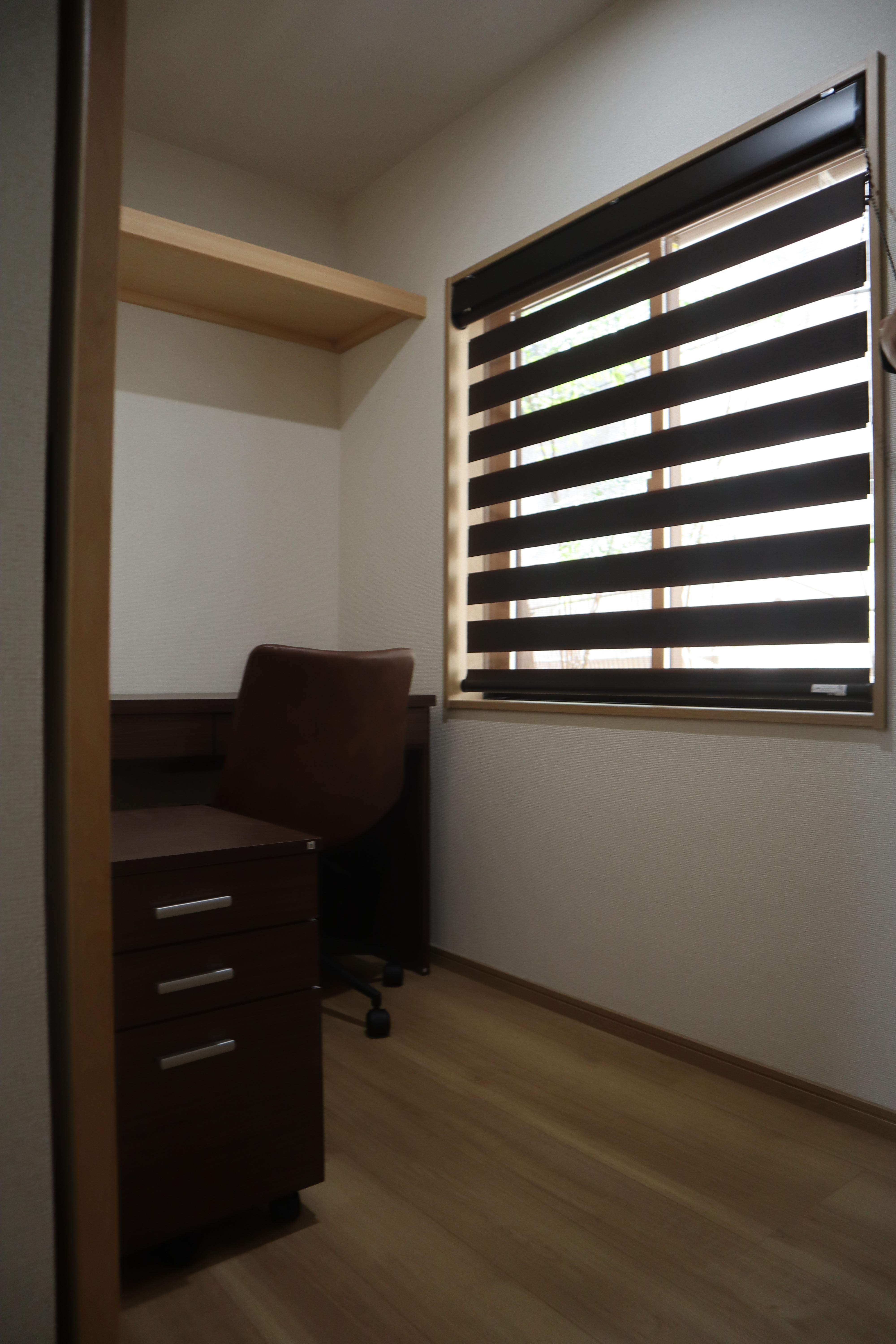 寝室横にワークスペースを確保しました。 寝室とワークスペースを扉で仕切ることで、オン・オフの区切りがしっかりでき作業効率も上がります。 また、オンライン会議の時も、家族の声が気にせず集中できます。