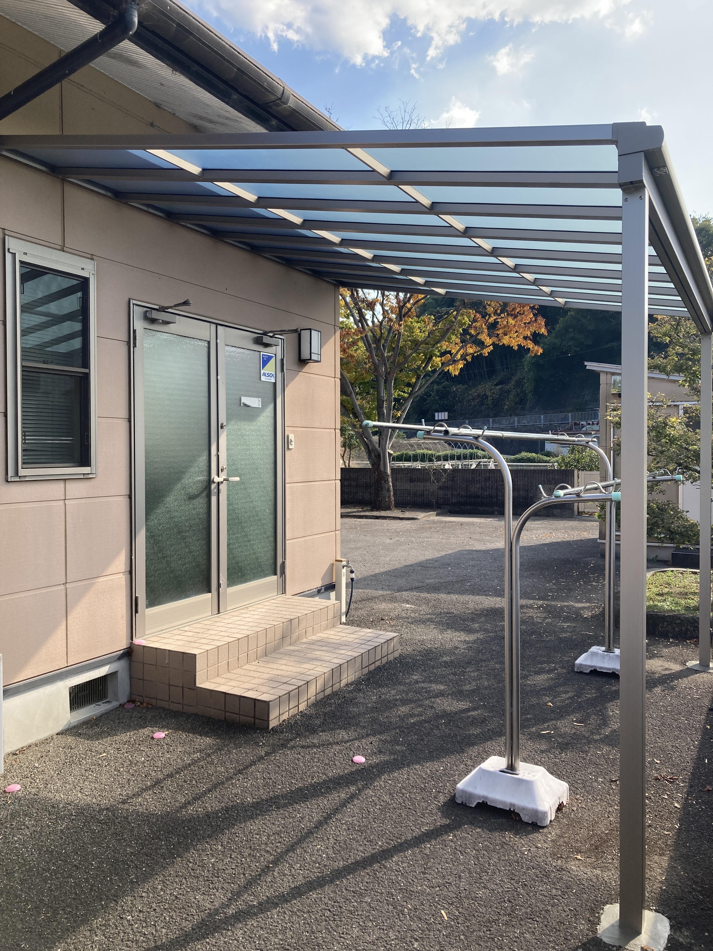 「物干し竿を置いている場所の軒が小さく、雨が降ると濡れてしまい不便なのでテラスを取り付けたい」とのご相談を受け、屋根となるテラスを設置させていただきました。テラスはLIXILスピーネF型を設置しました。