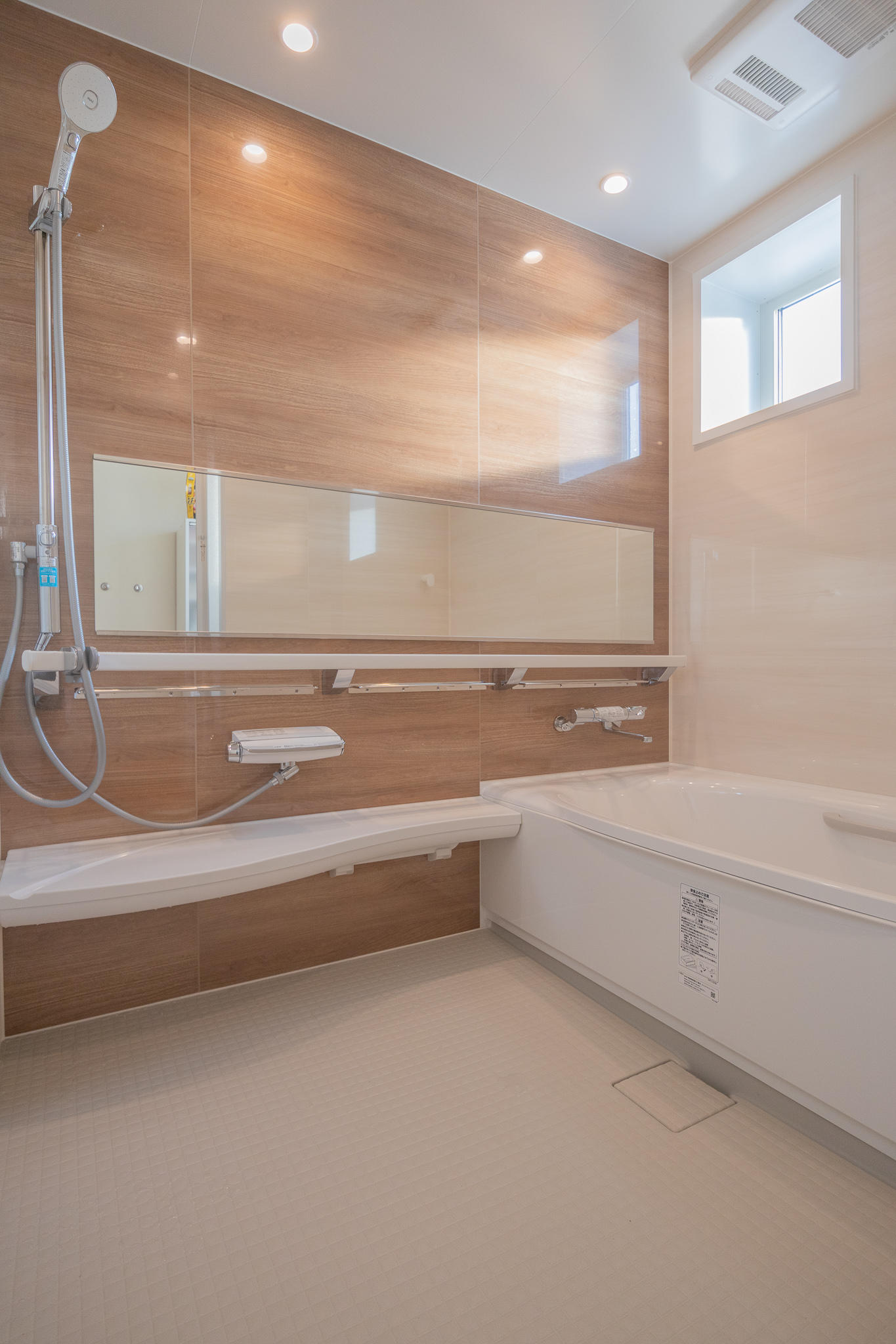 ご希望は「おしゃれで温かく」でしたので、壁・天井・床は断熱材を入れ、浴室換気乾燥暖房機も設置しました。当初のご希望どおりに仕上がり、お客様に喜んでいただけてました。